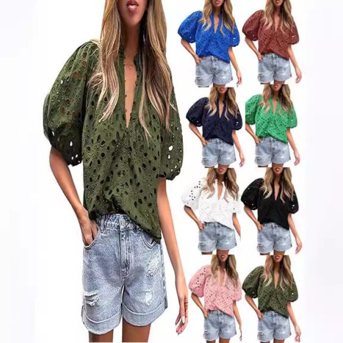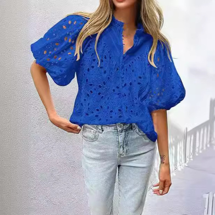 2025女式夏季上衣時尚休閒燈籠袖 V 領紐釦鏤空蕾絲刺綉襯衫