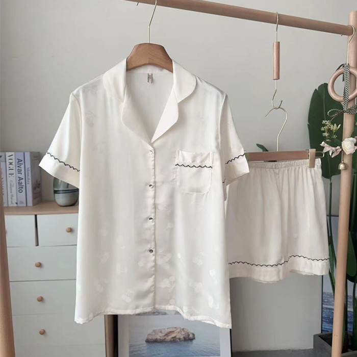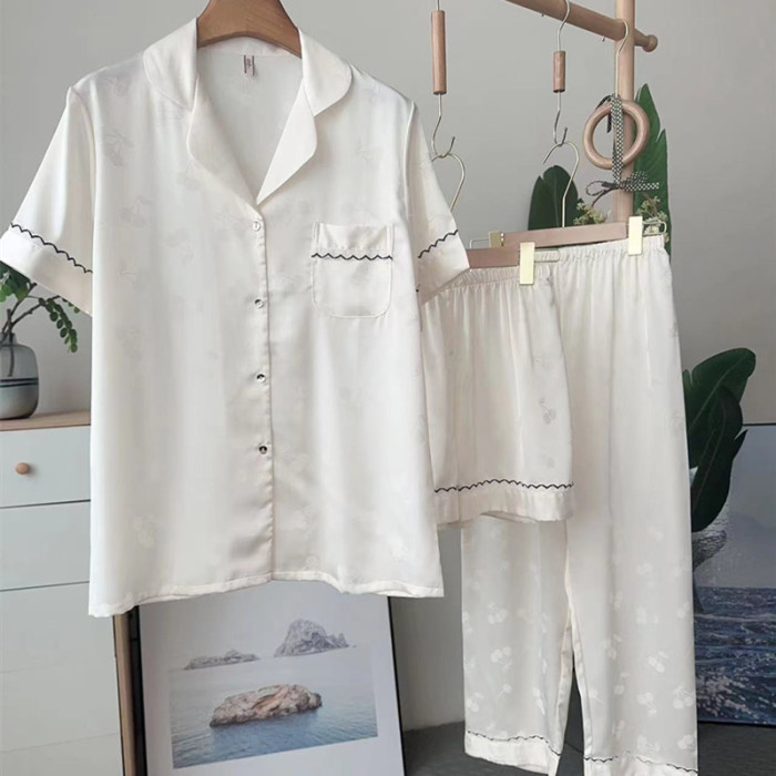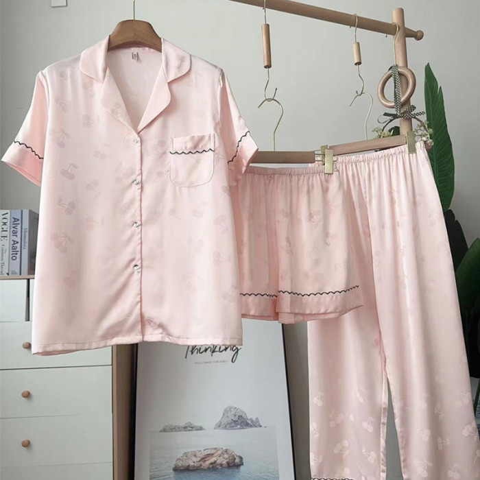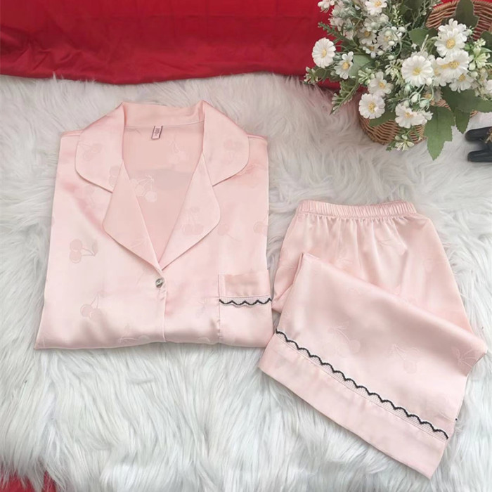 春秋季短袖長褲冰絲睡衣女可愛小櫻桃提花純色網紅可外穿家居服夏