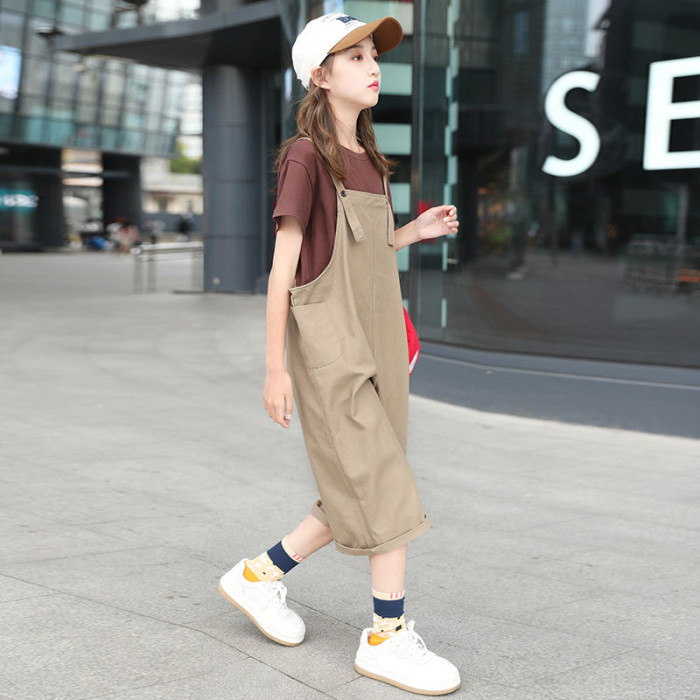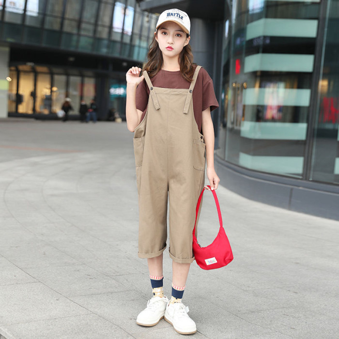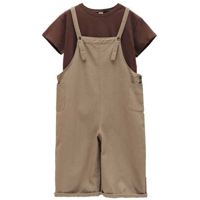 韓國女童吊帶褲夏裝2025新款寬松短袖中大童網紅洋氣背帶褲兩件套