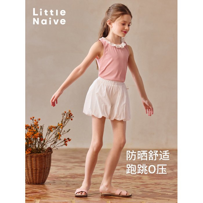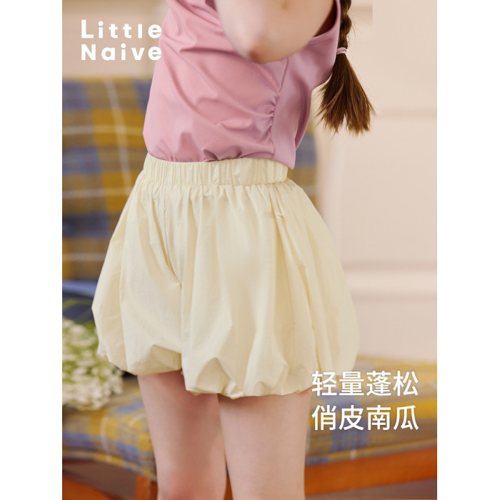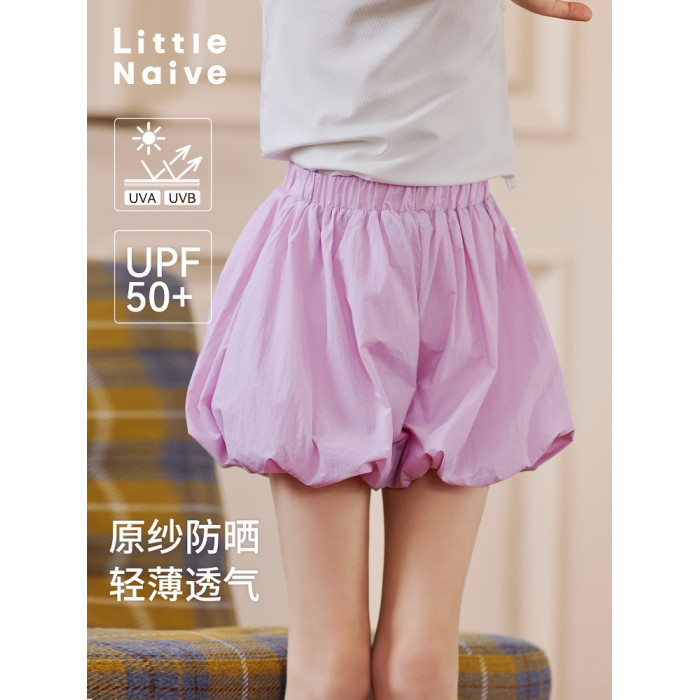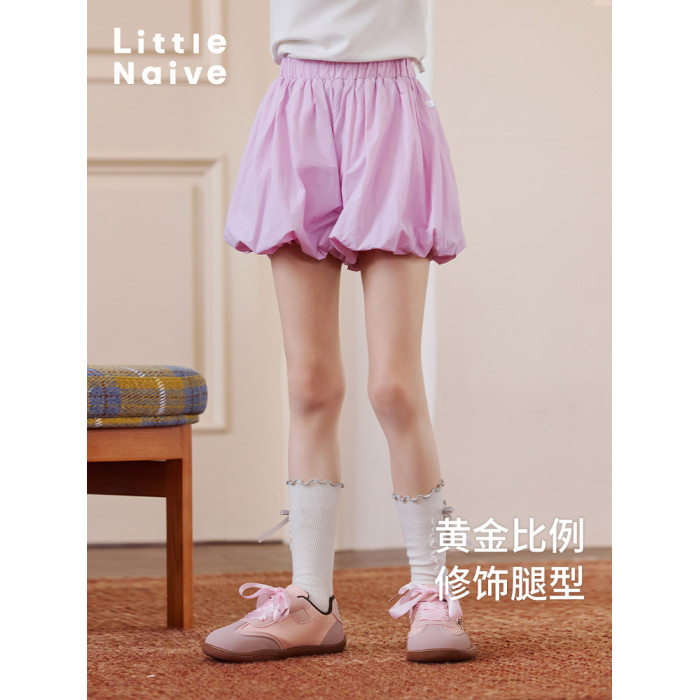 Little Naive女童甜美休閒褲夏季新款透氣花苞褲兒童皺感防曬短褲