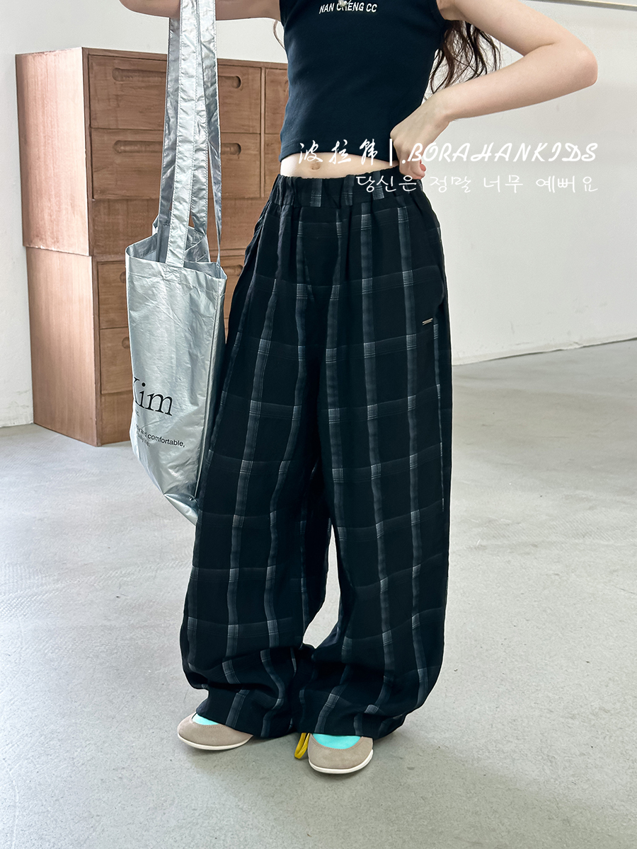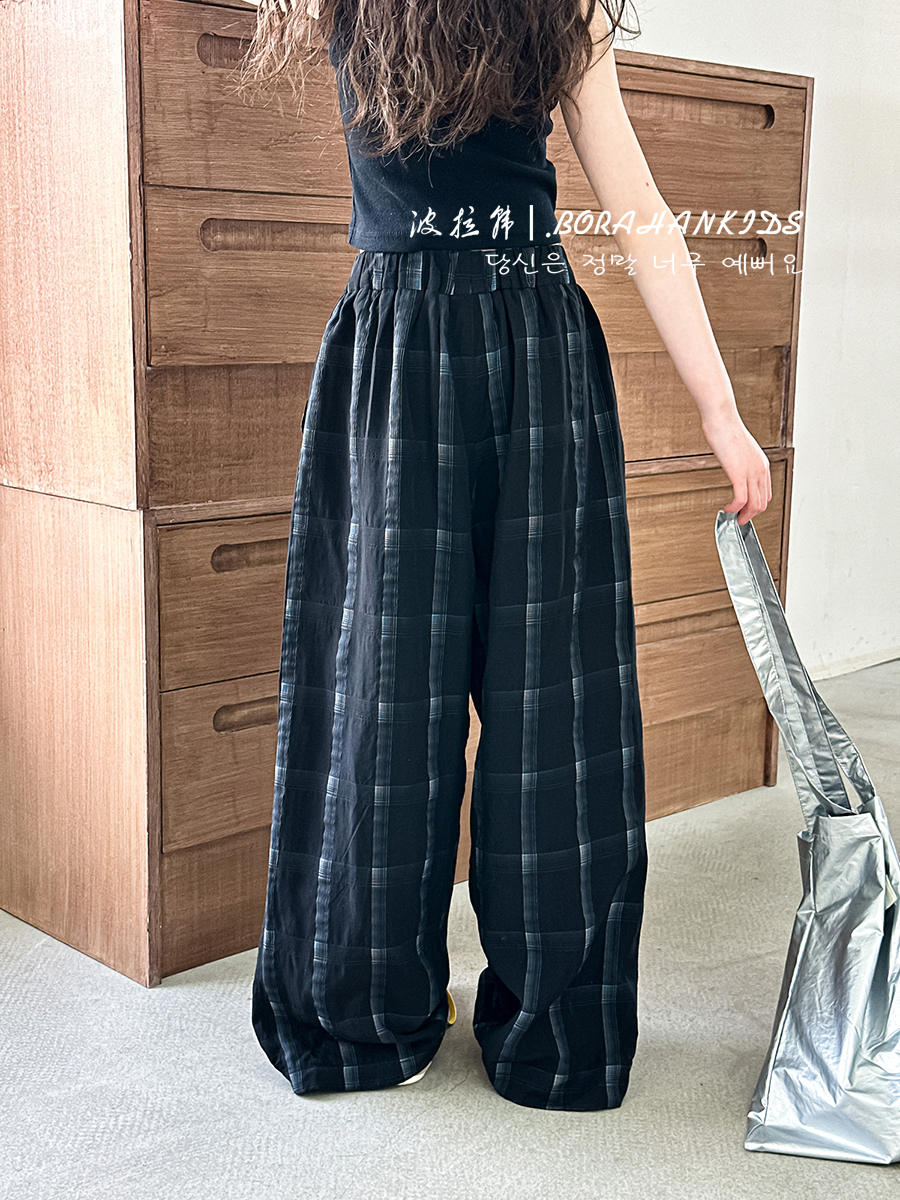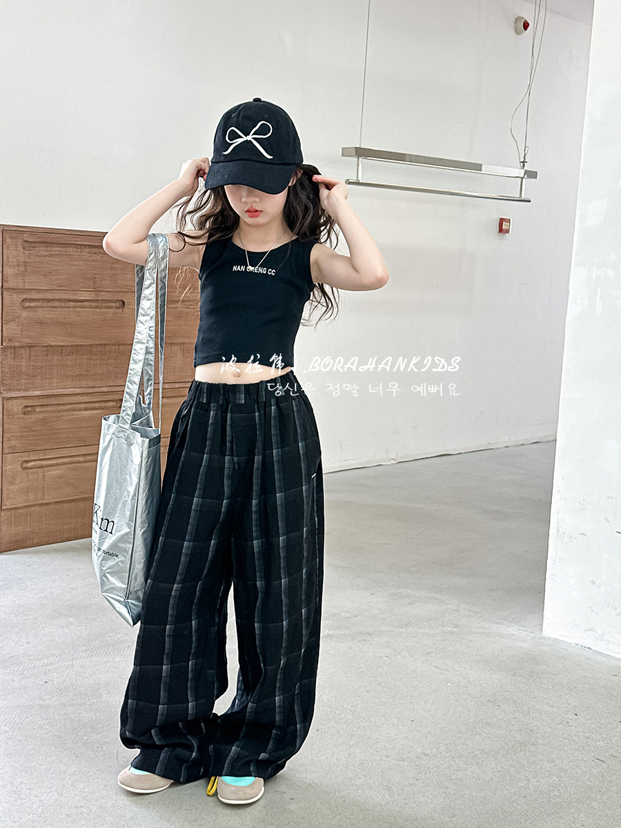 波拉韓女童休閒褲夏季褲子2025新款兒童格子直筒褲中大童防蚊長褲