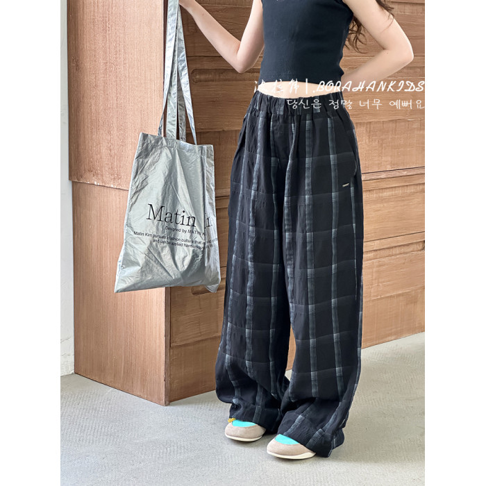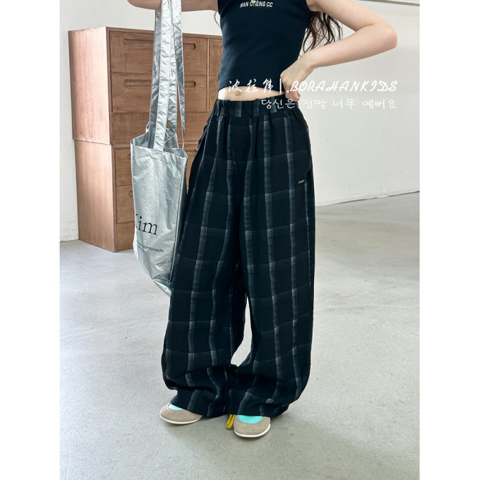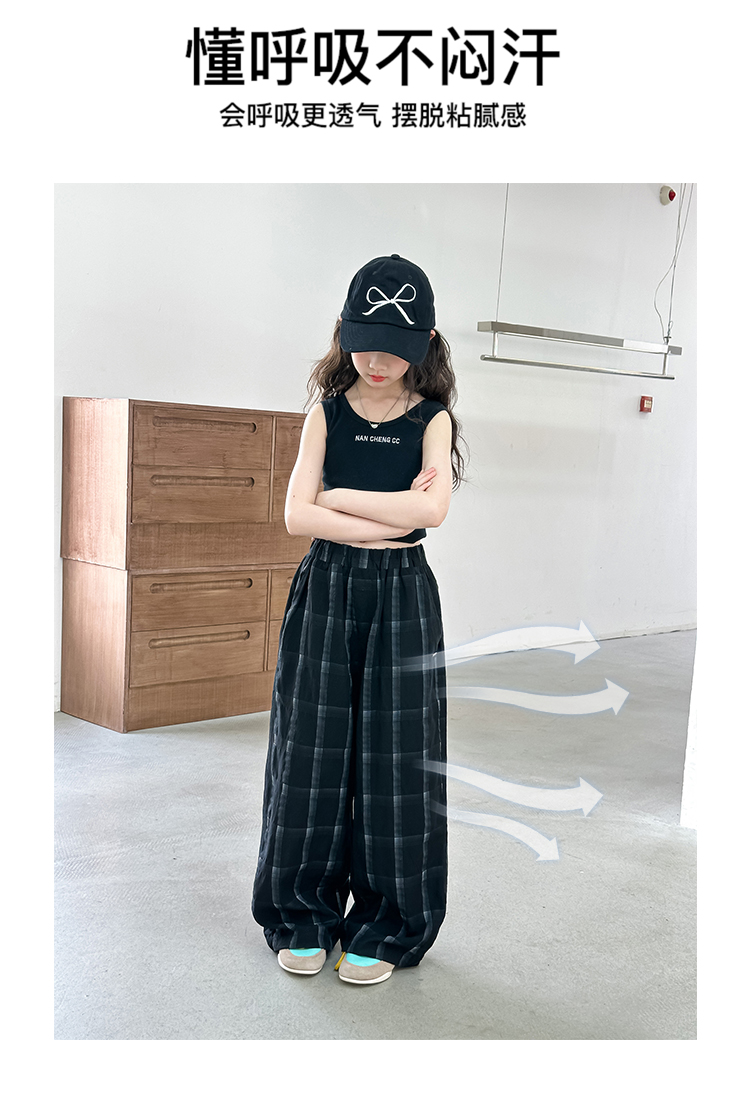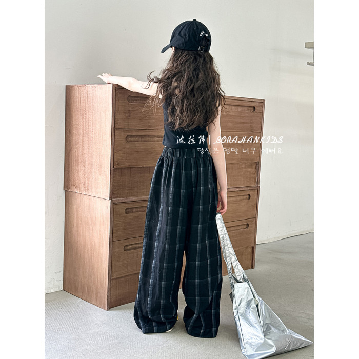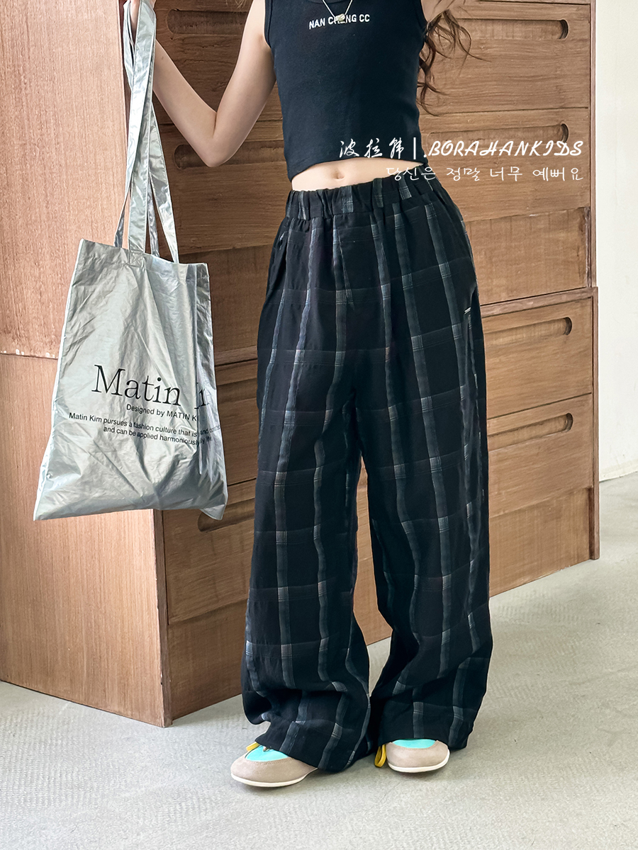 波拉韓女童休閒褲夏季褲子2025新款兒童格子直筒褲中大童防蚊長褲