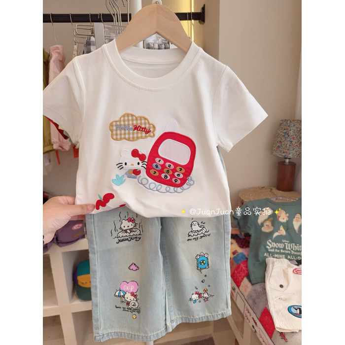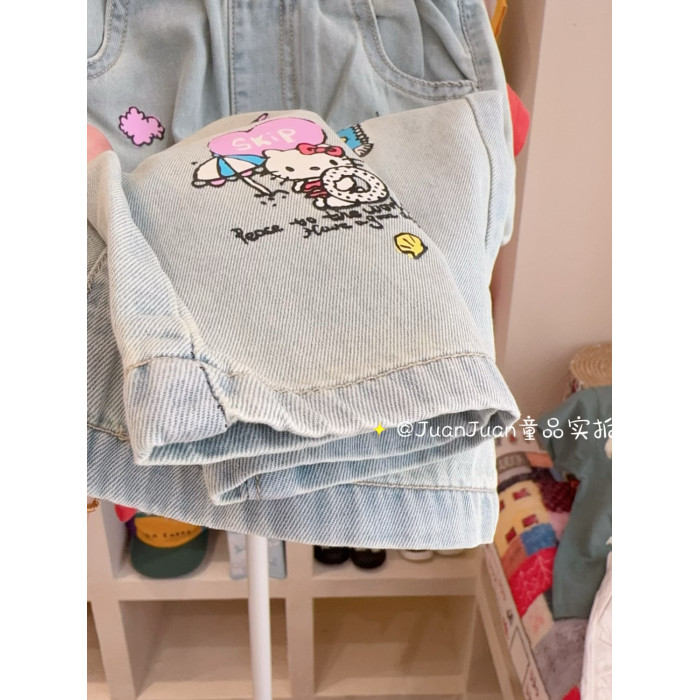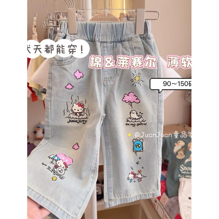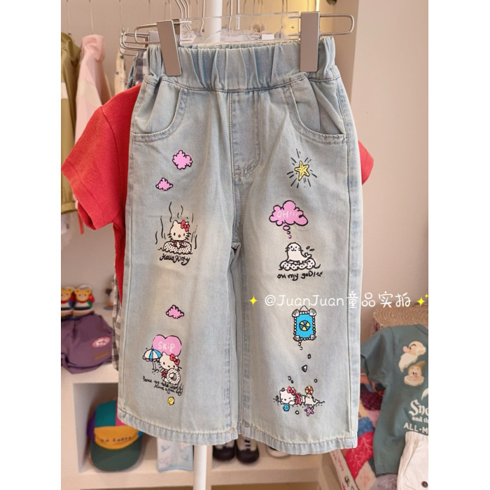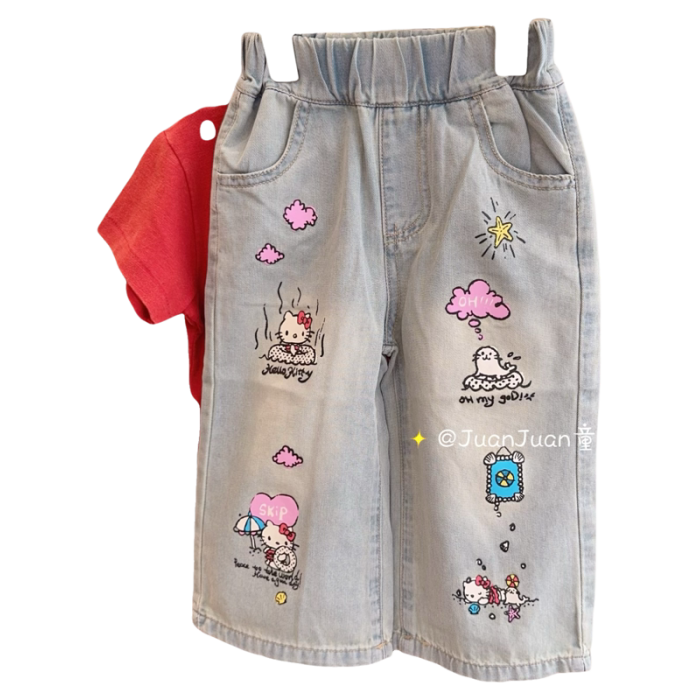 夏季薄軟日系Kitty貓牛仔褲 女童春夏款可愛寬松濶腿褲女孩長褲