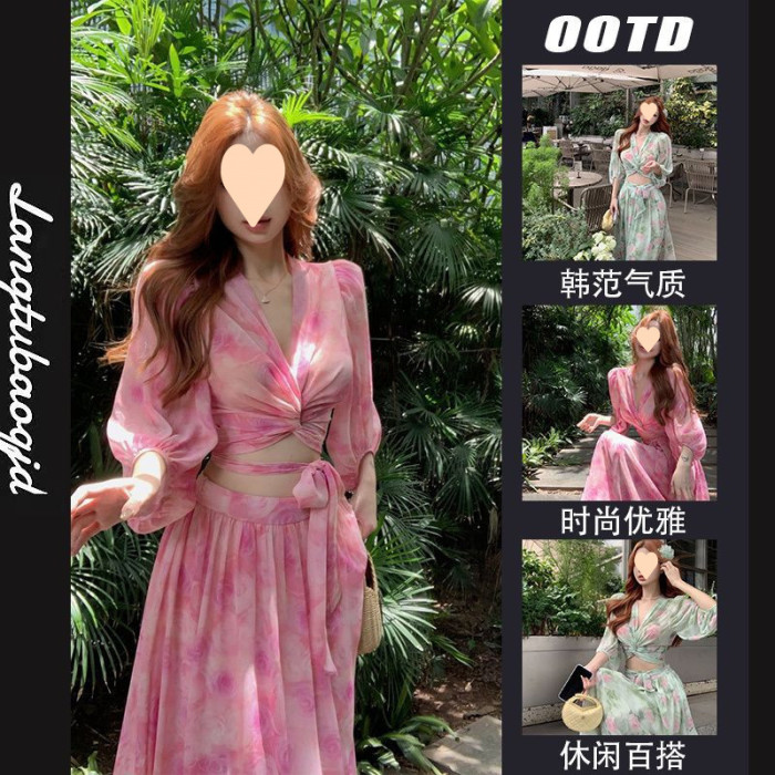 度假風穿搭海島套裝碎花褶皺領襯衫女春季高腰字裙半身裙兩件套