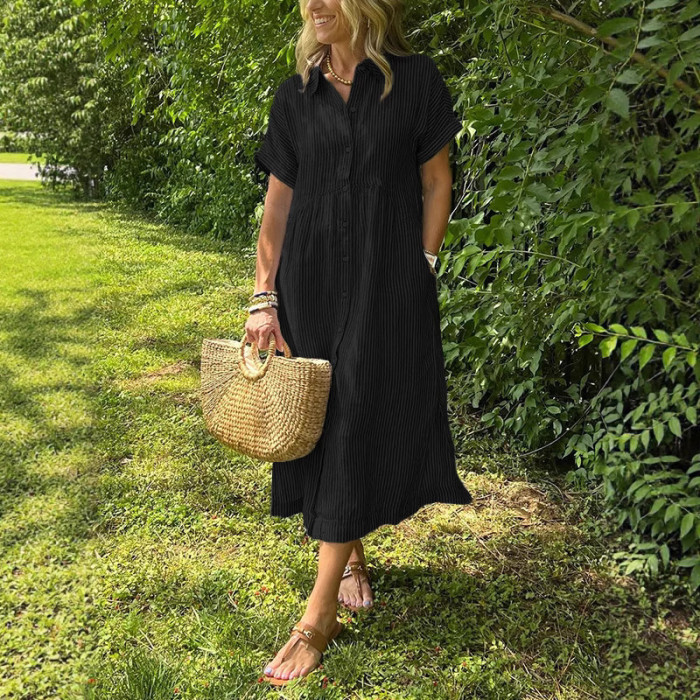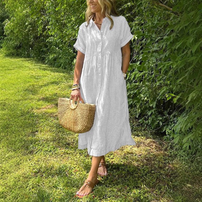 歐美寬松大碼條紋短袖襯衫連衣裙女夏季新款休閒棉麻中長裙子