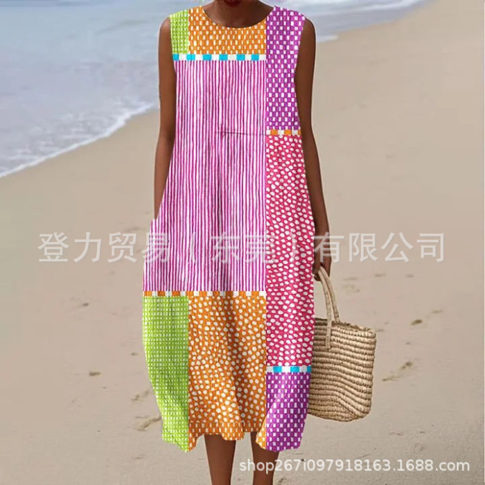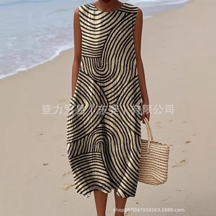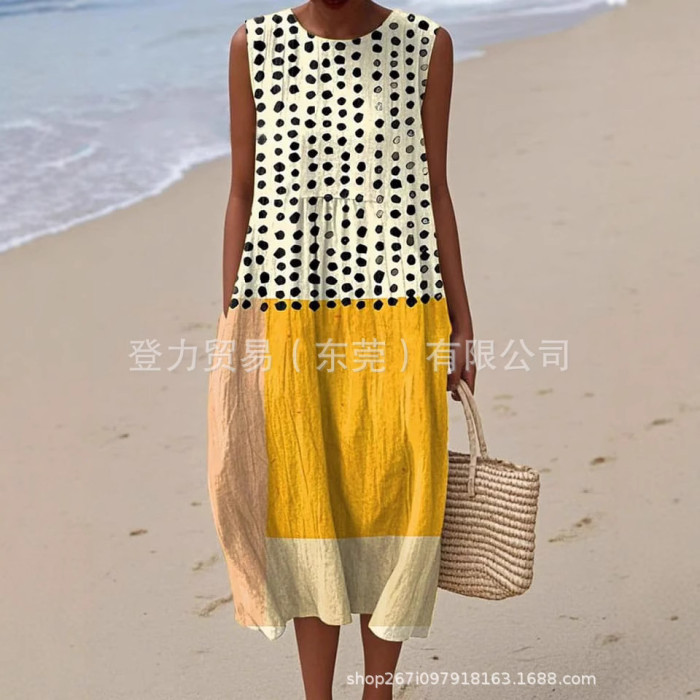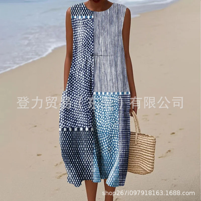 獨立站新款大碼女裝襯衫口袋短袖連衣裙海洋元素魚度假風連衣裙