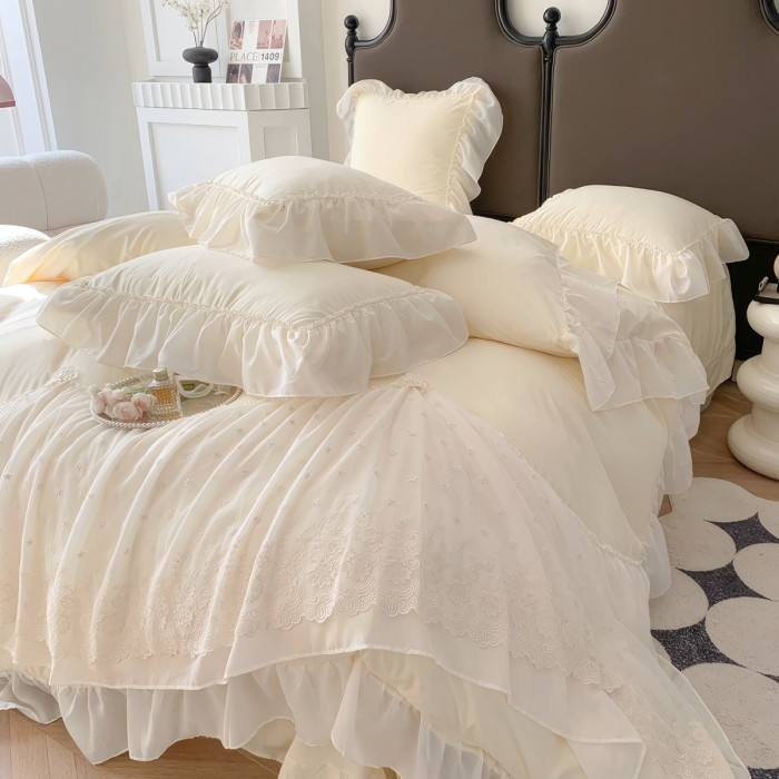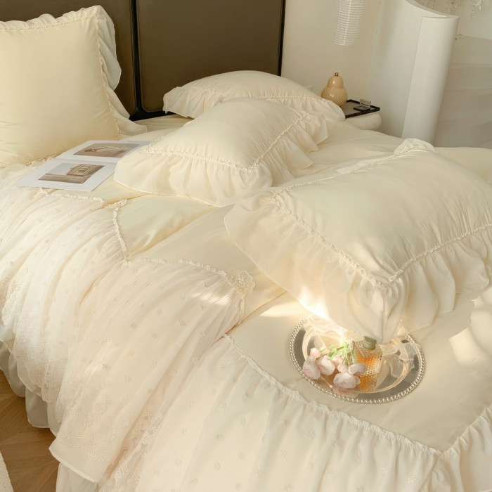 ins輕奢高級公主愛麗莎系列雪紡花邊四件套仙仙純色親膚床單被套4
