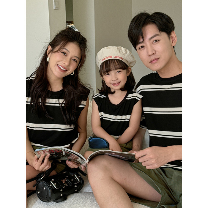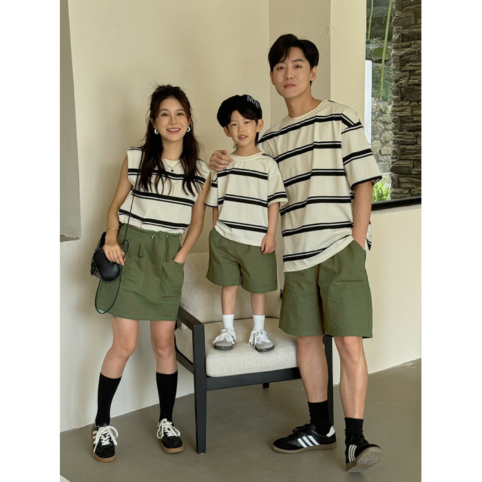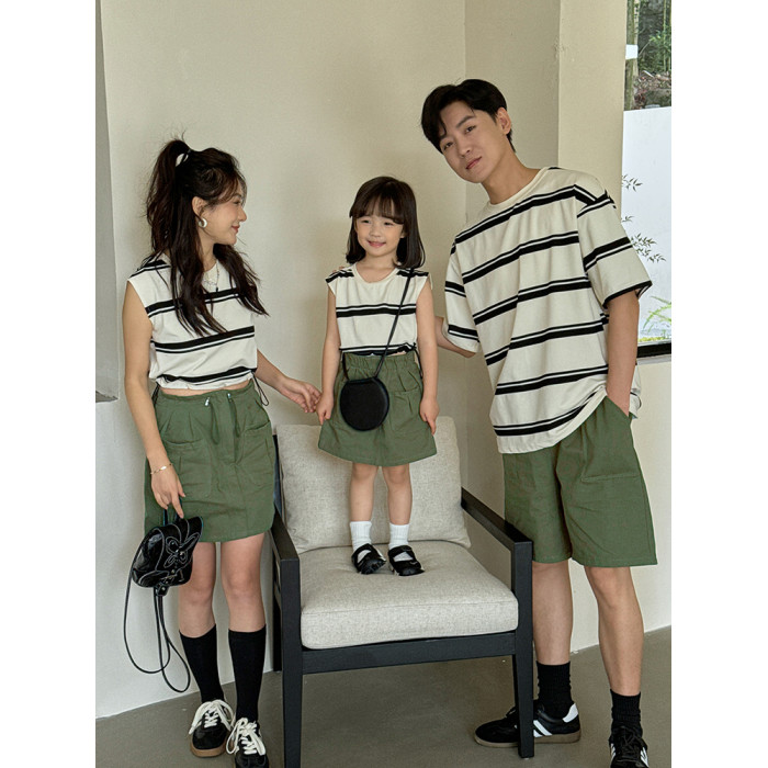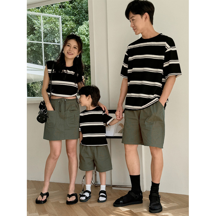 親子裝短袖夏季一家三四口條紋Tt衫全家裝母女裝短褲半袖露臍裝潮