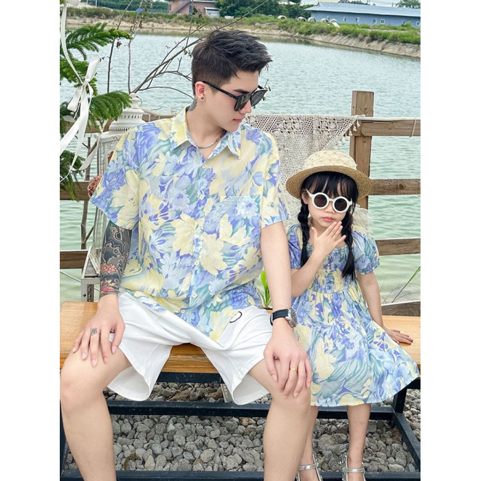 海邊度假親子裝母女款沙灘連衣裙一家三口四出遊母子夏威夷花襯衫