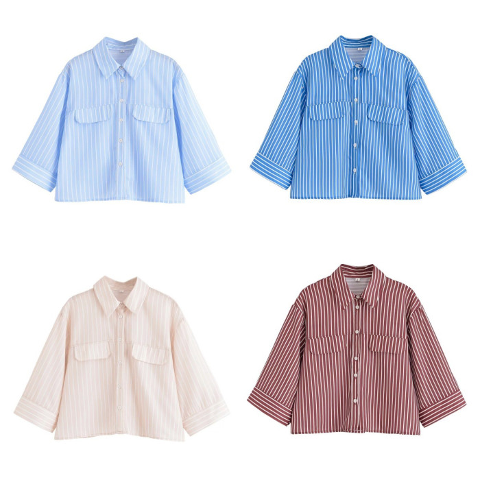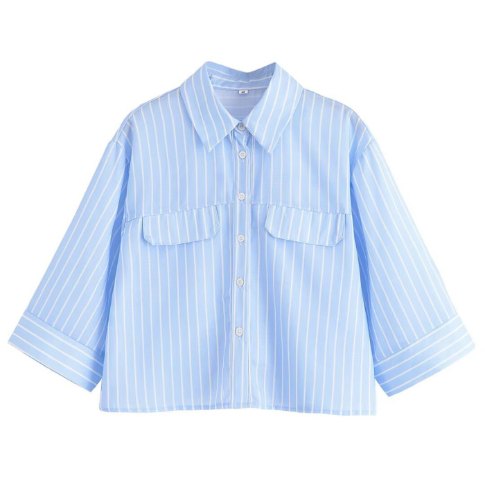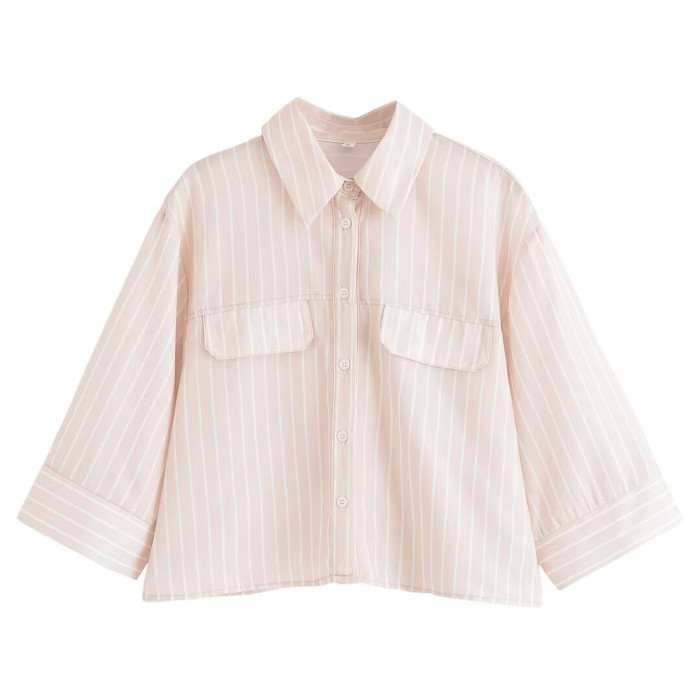 歐美2025夏新款女裝寬松短袖條紋上衣翻領襯衫女
