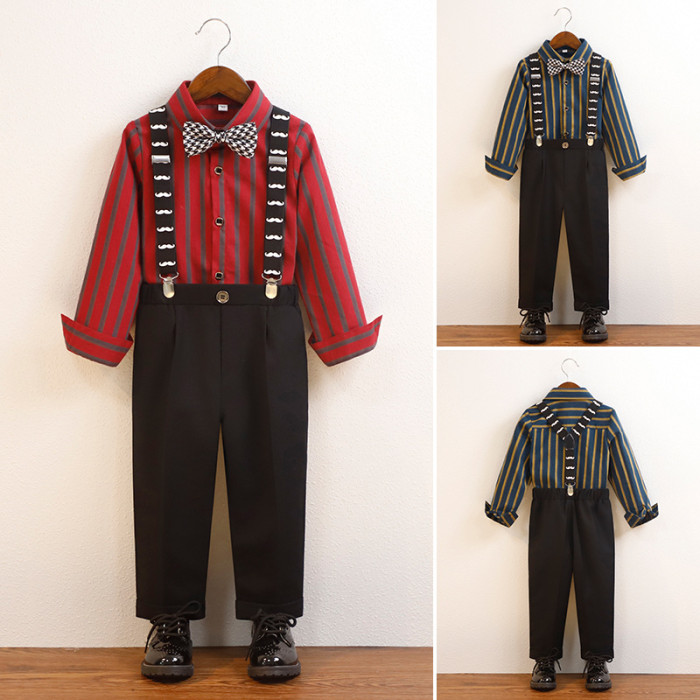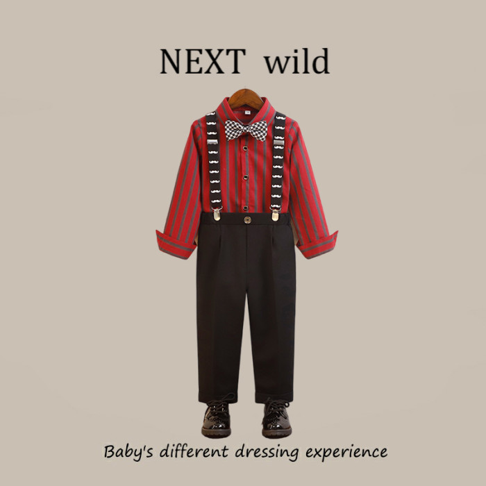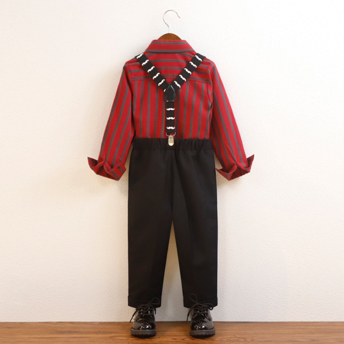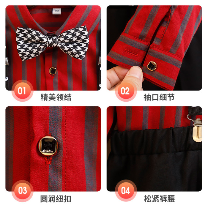 紅條紋4件套(襯衫+長褲+背帶+領結)