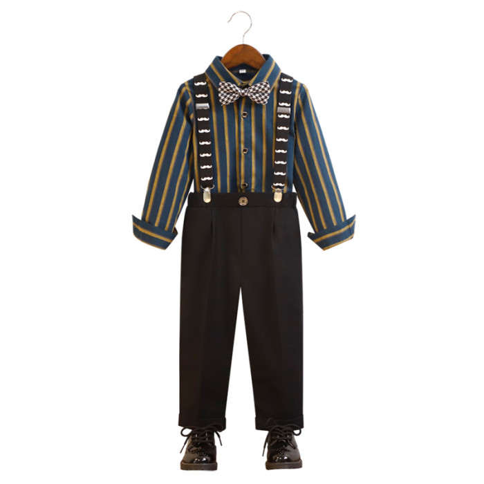 藍條紋4件套(襯衫+長褲+背帶+領結)