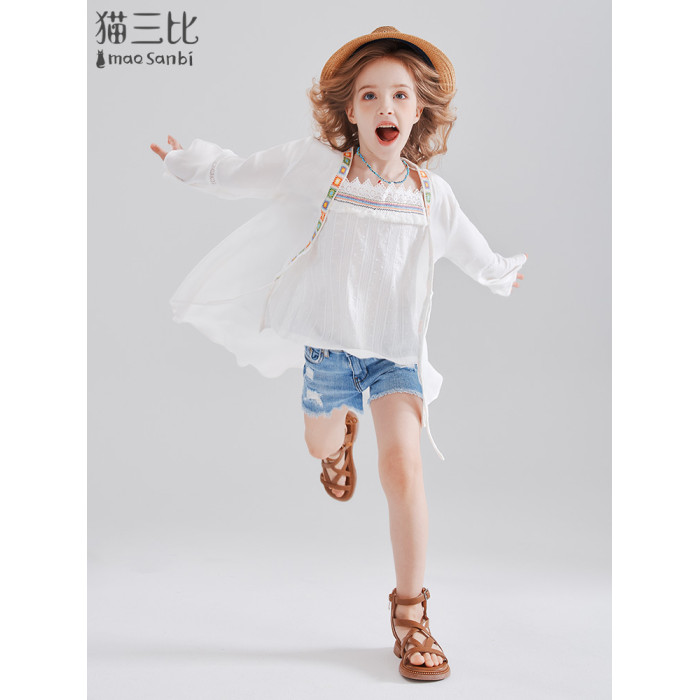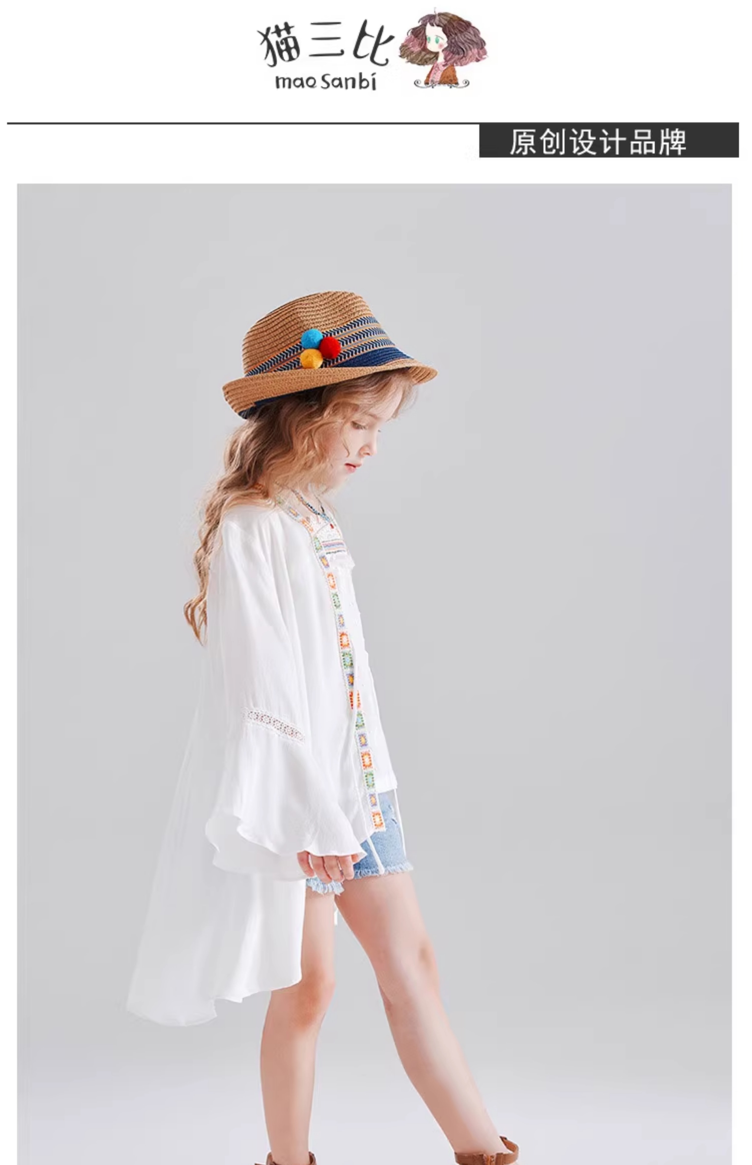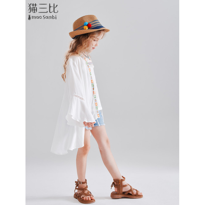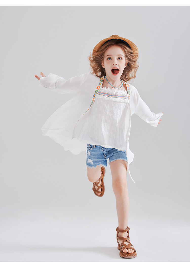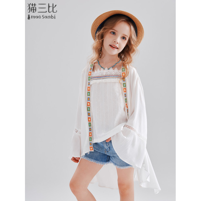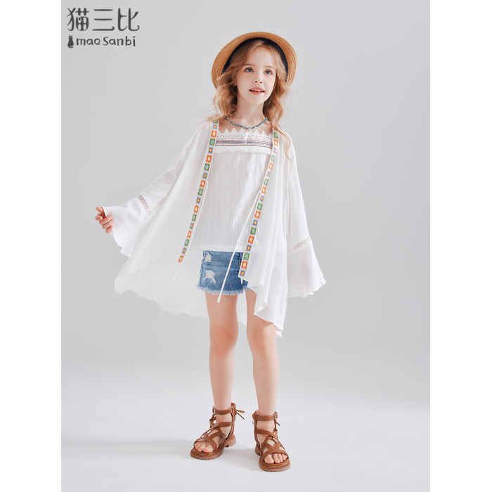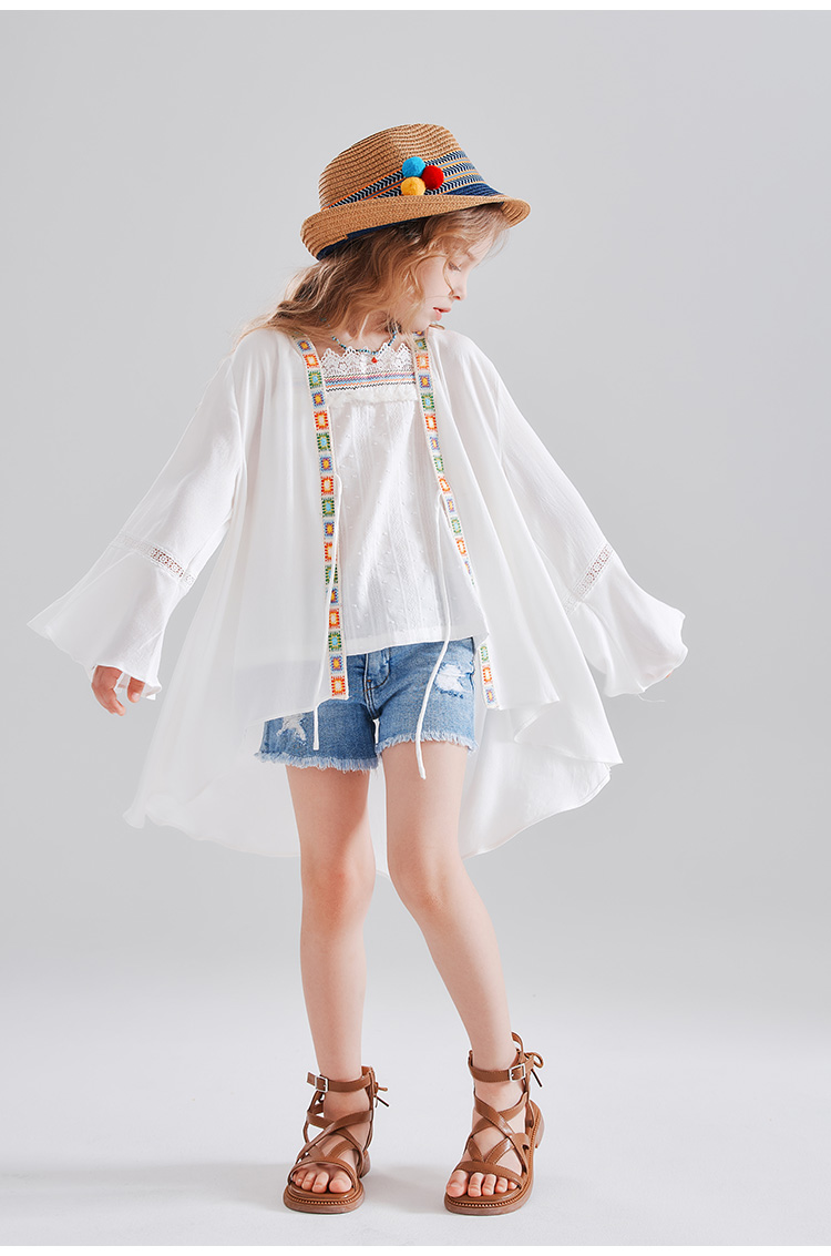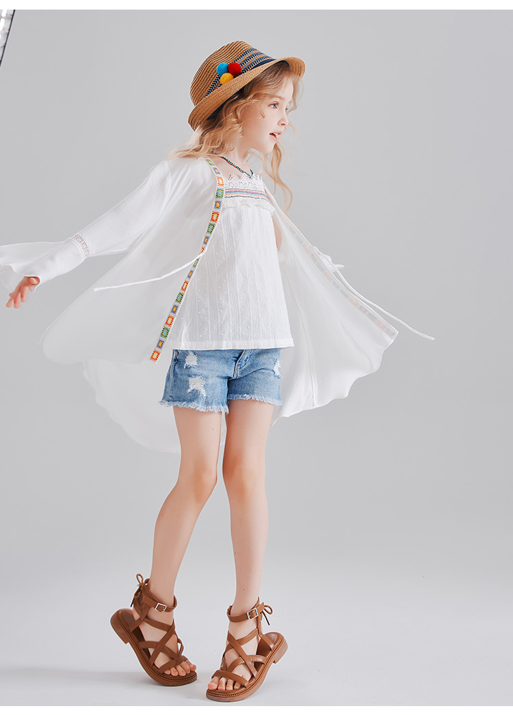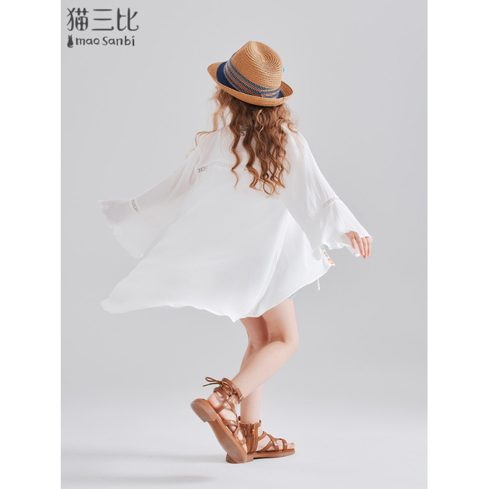 海邊度假沙灘女童防曬衣中長款白色開衫兒童外套薄款夏季外搭披肩
