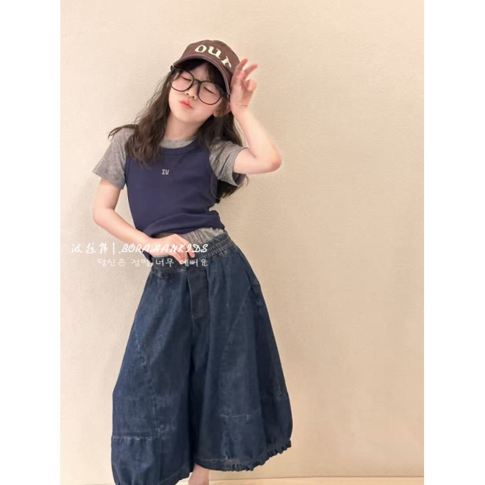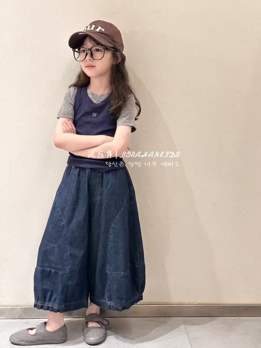 波拉韓女童夏季牛仔褲2025新款兒童薄款哈倫褲子九分中大童花苞褲