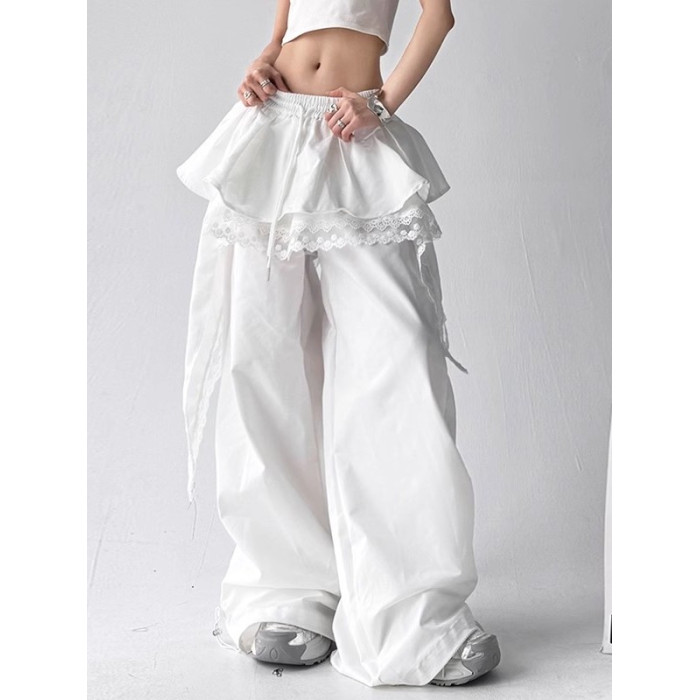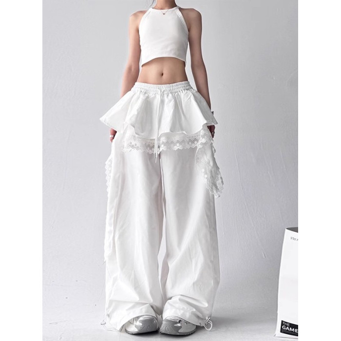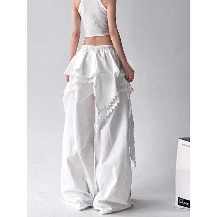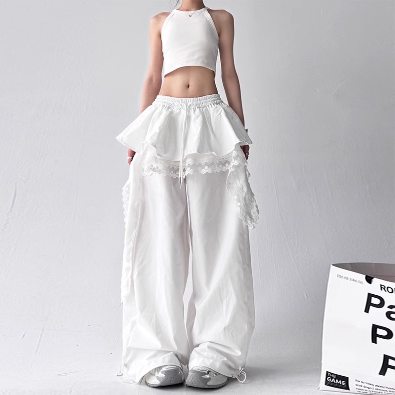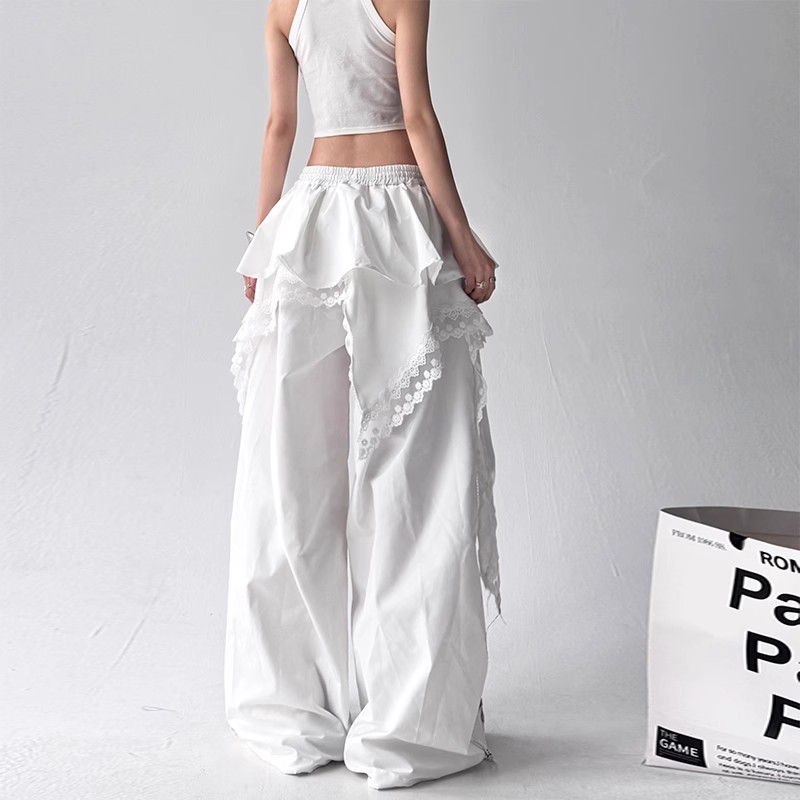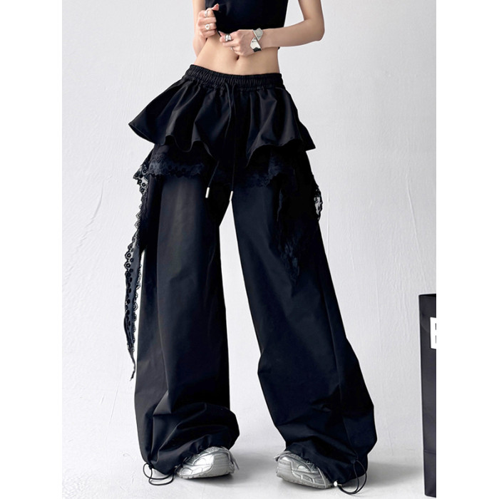 女童不規則蕾絲邊工裝褲夏季薄款中大童爵士街舞kpop寬松直筒長褲