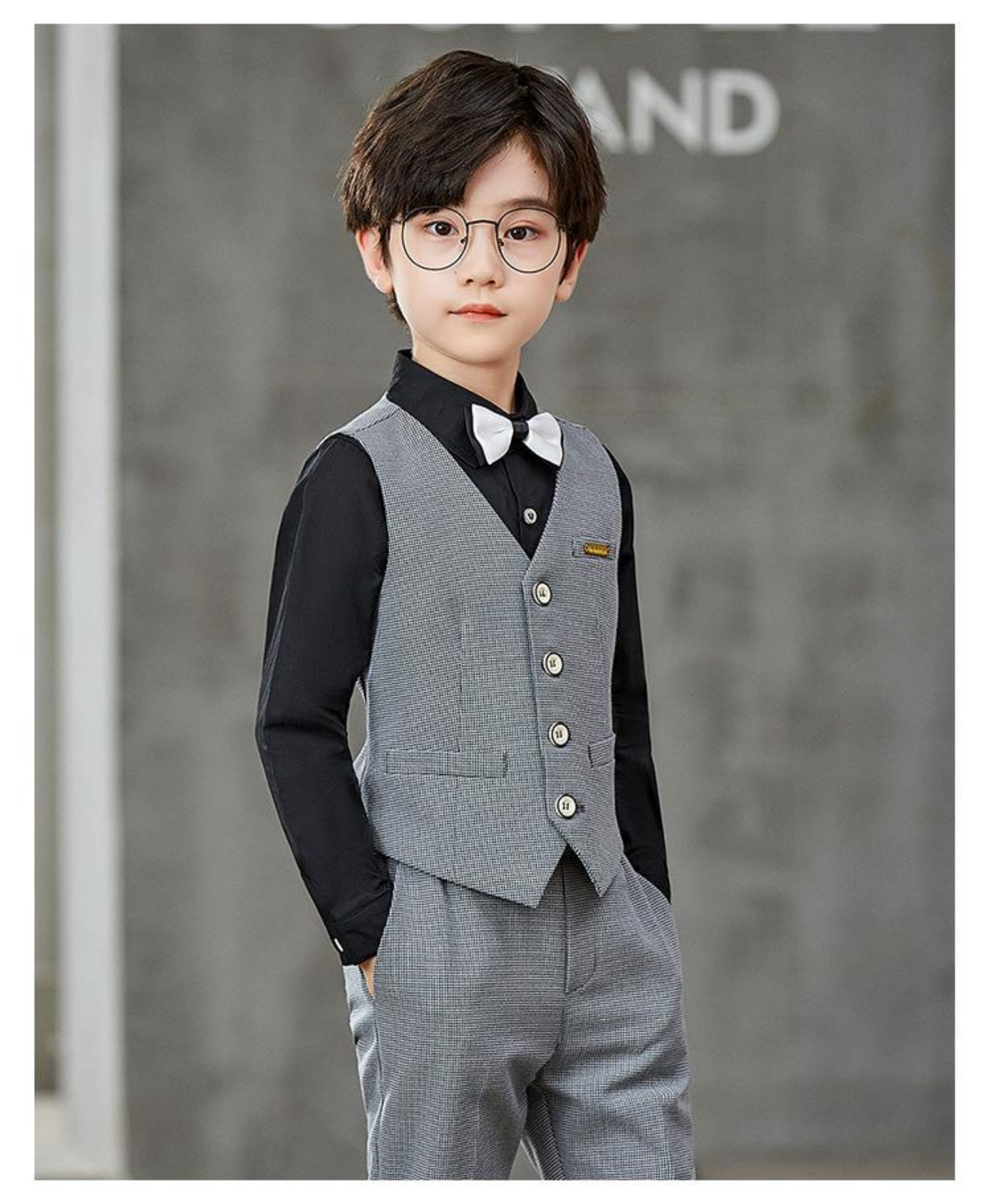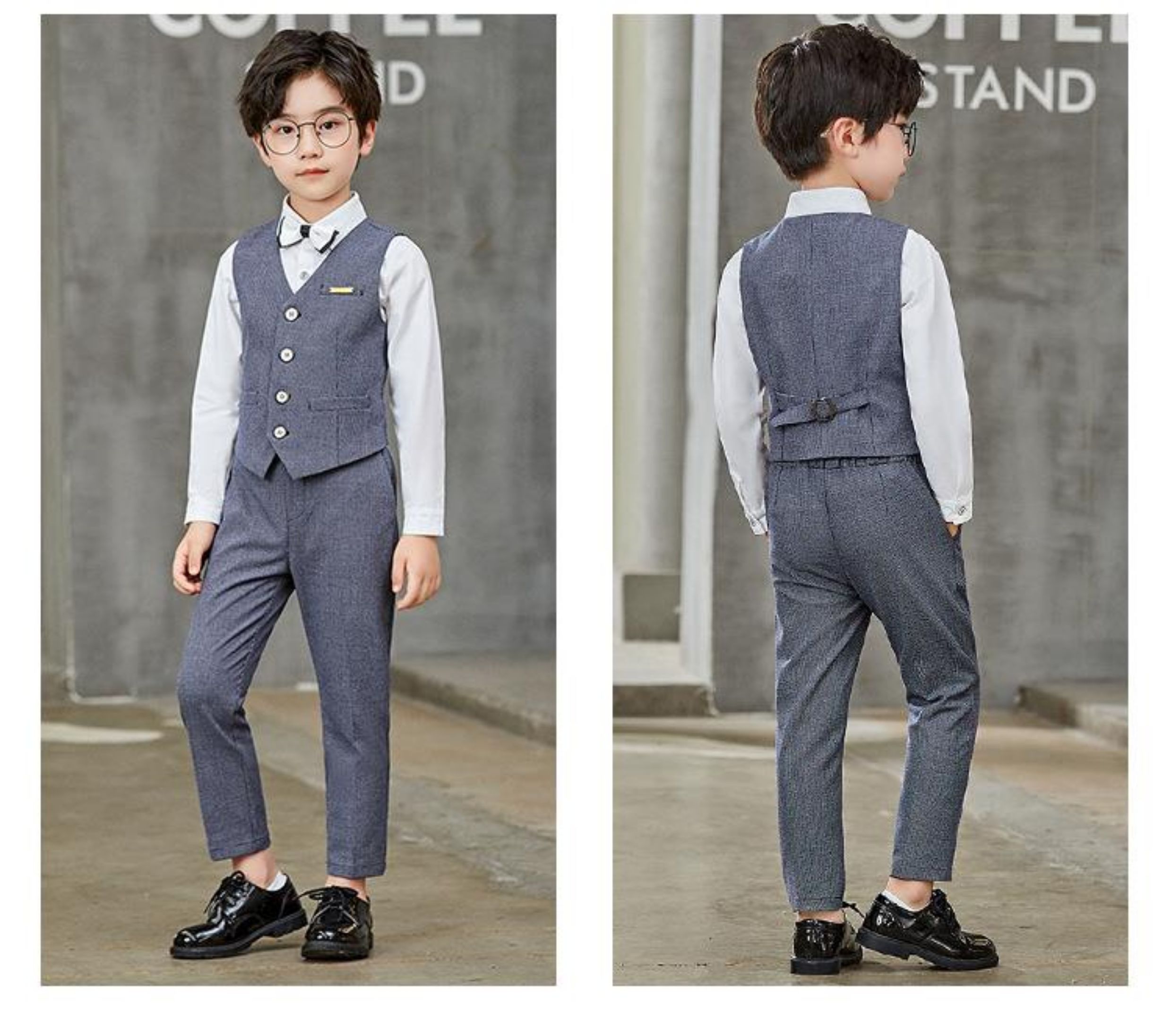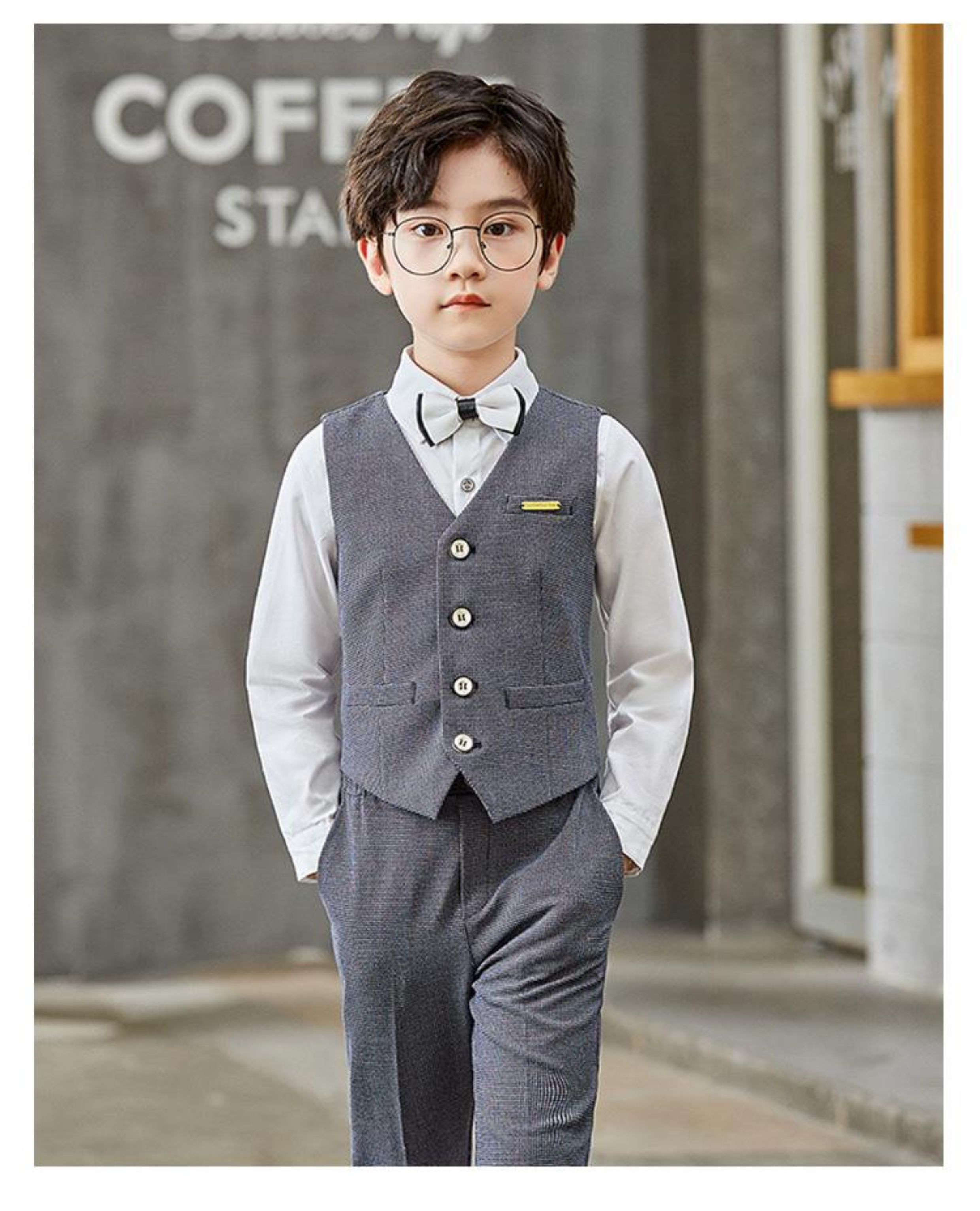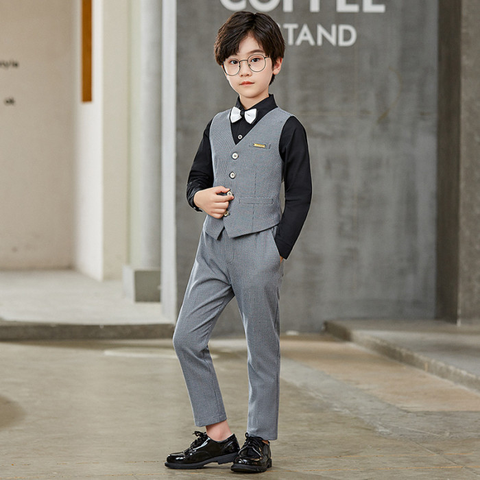 灰色4件套(白襯衫+馬甲+長褲+領結)
