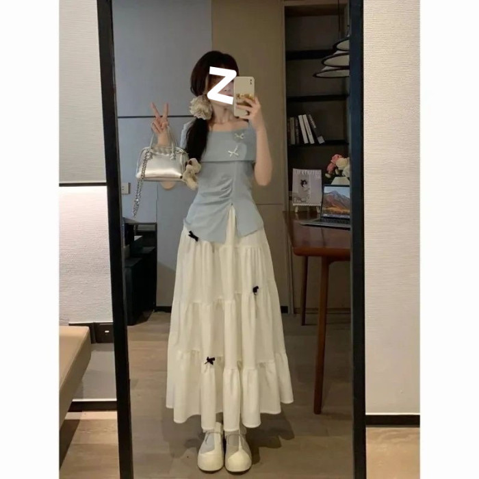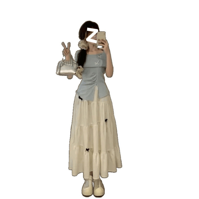 法式溫柔風蝴蝶結設計感夏季藍色開叉長袖上衣高腰修身半身裙套裝