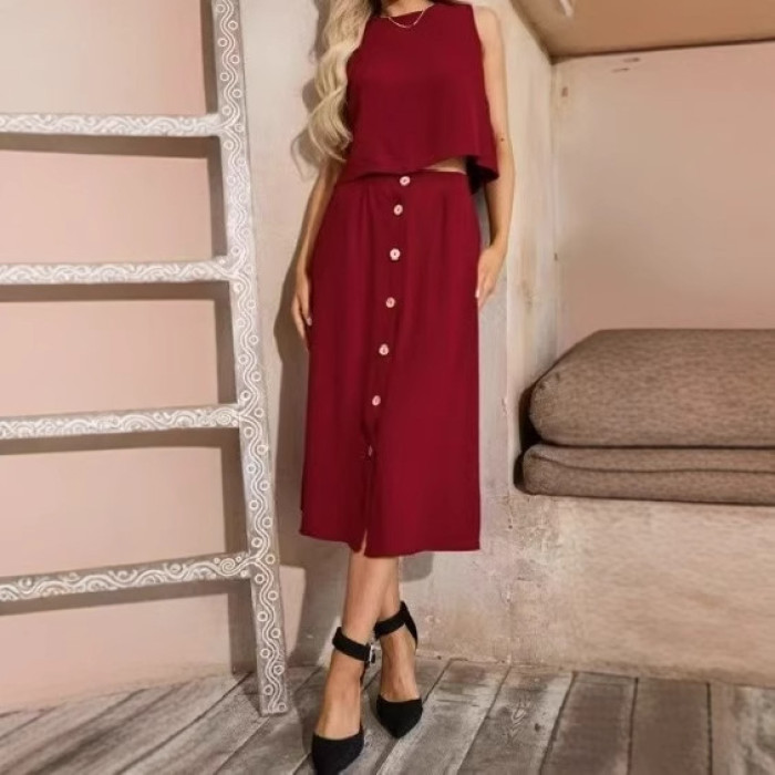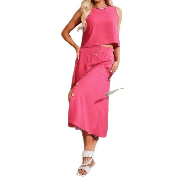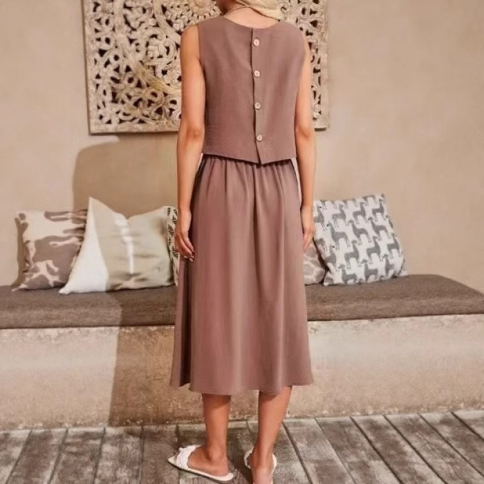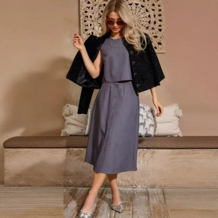 2025歐美時尚套裝女新款休閒舒適純色套裝裙圓領釦子設計