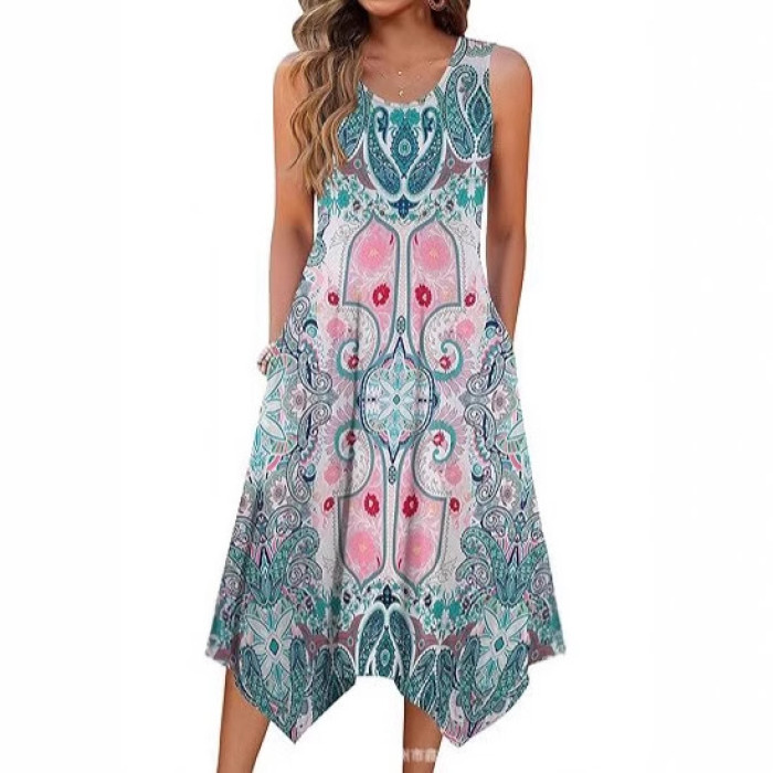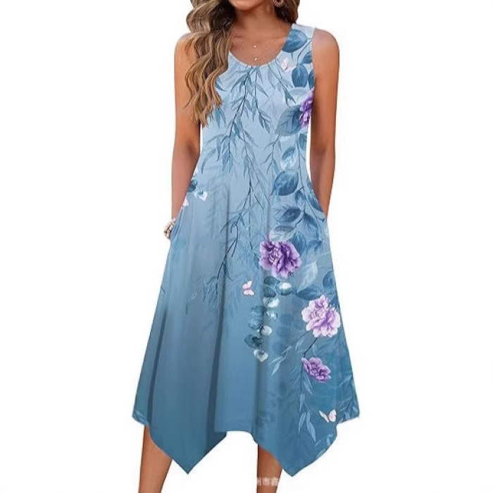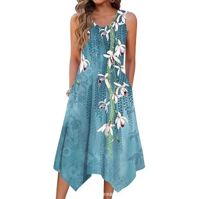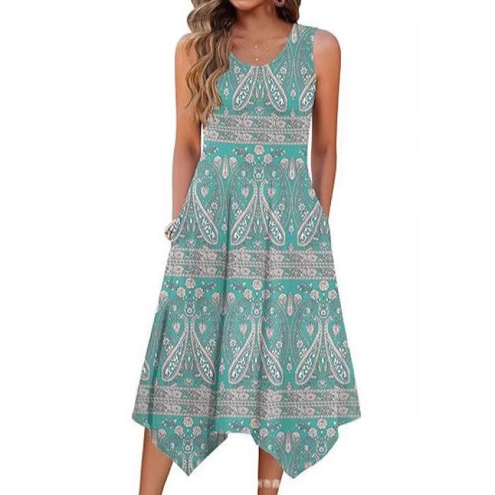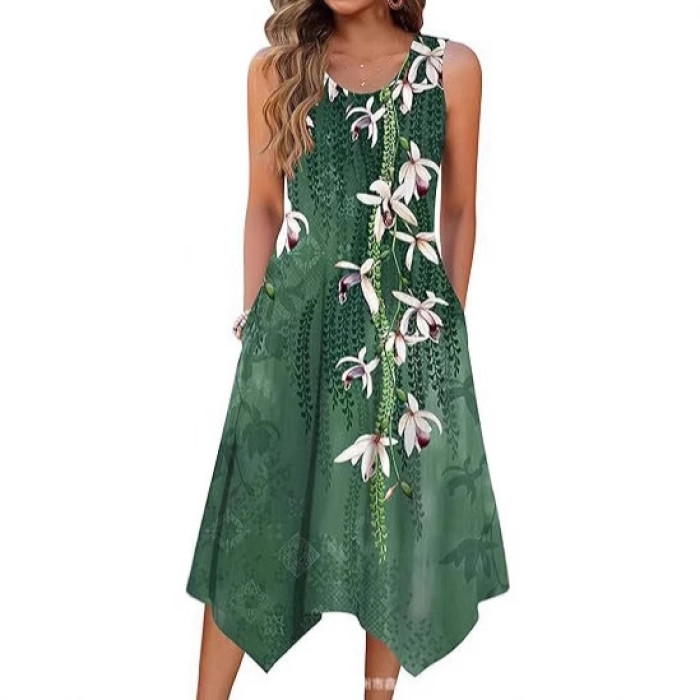 2025女式休閒連衣裙夏季背心裙寬松飄逸沙灘裙帶口袋中長款背心裙