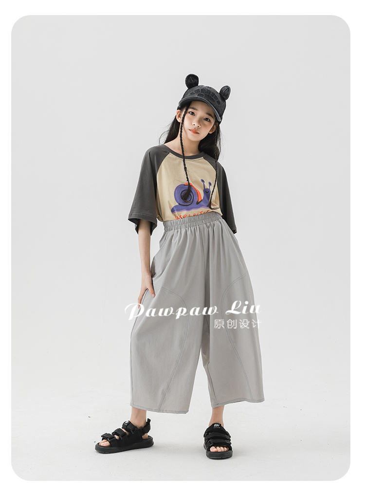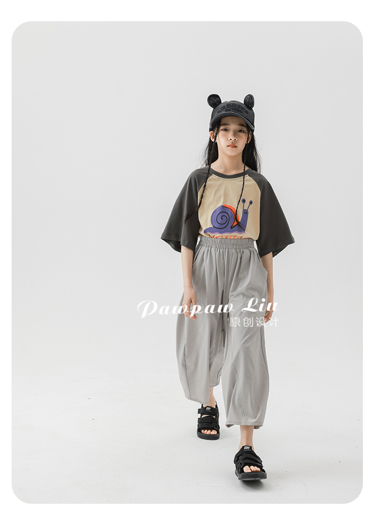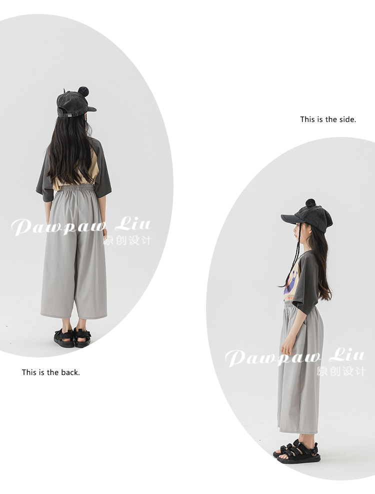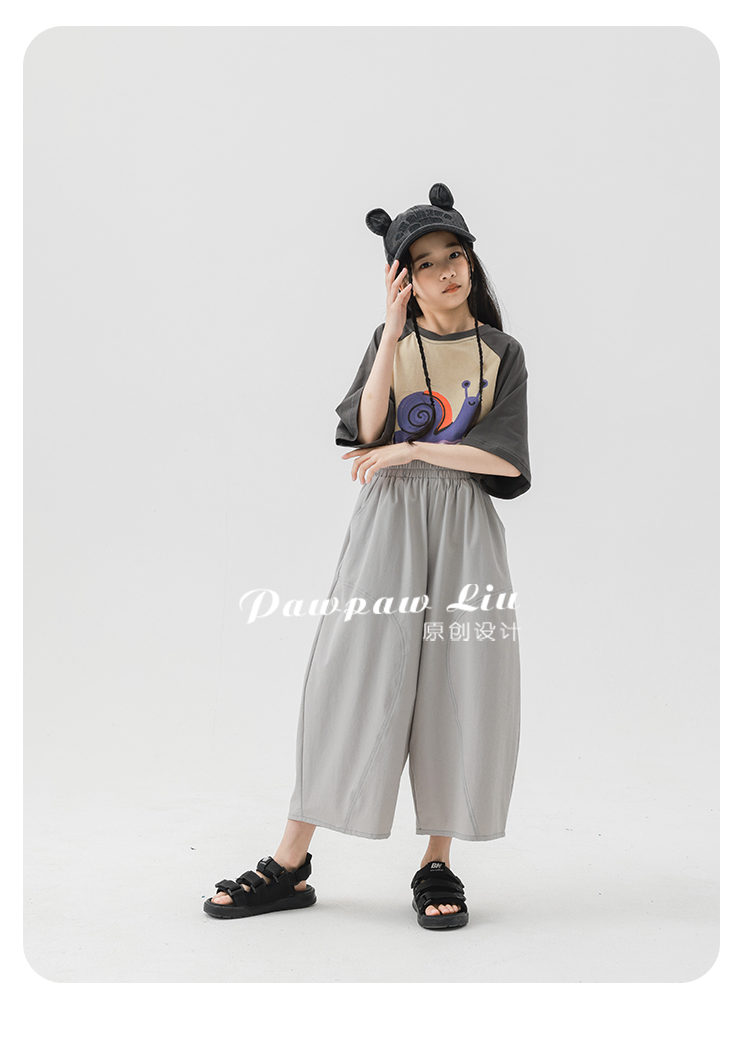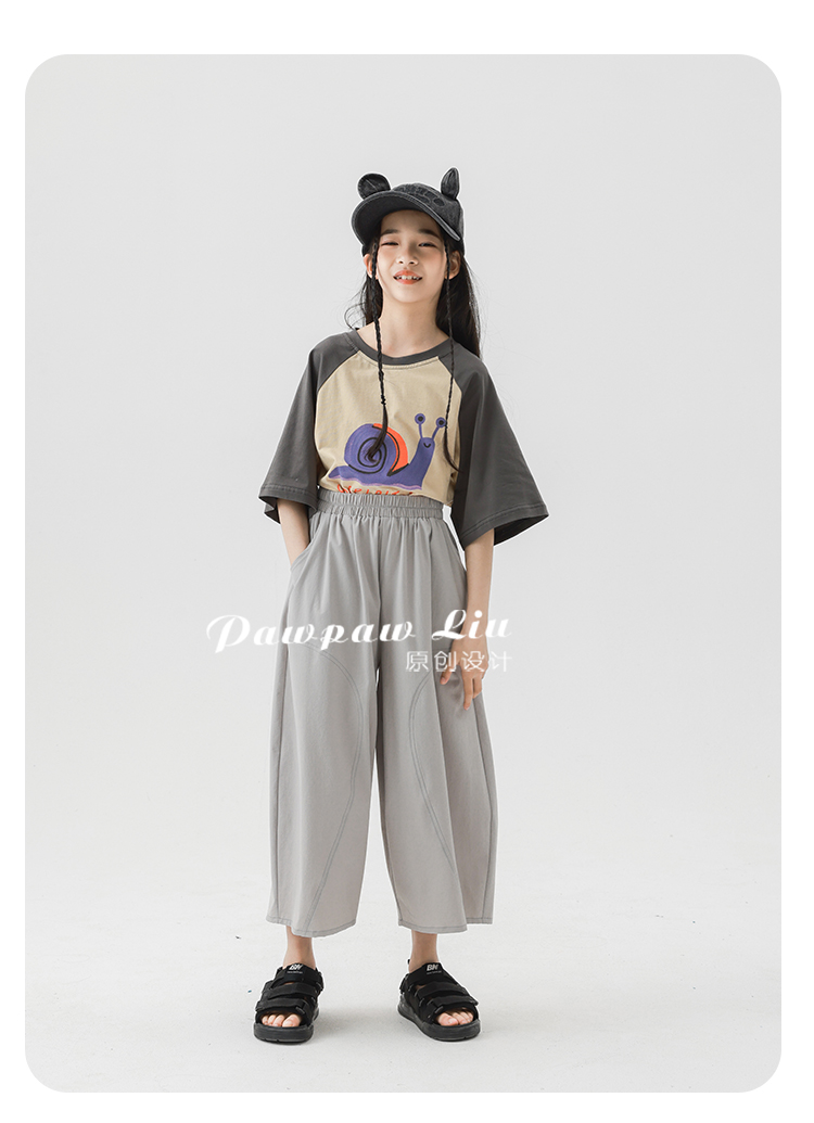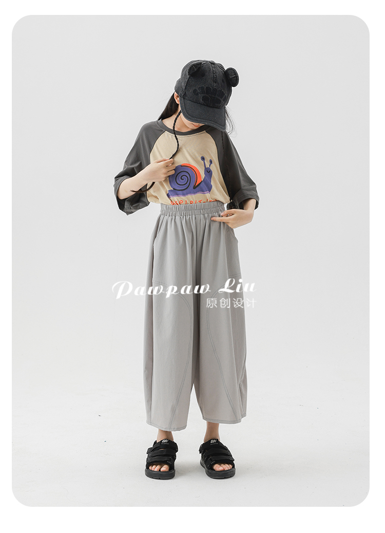 Pawpaw Liu原創設計女童褲子夏薄款2025新品兒童淺灰八分褲寬松
