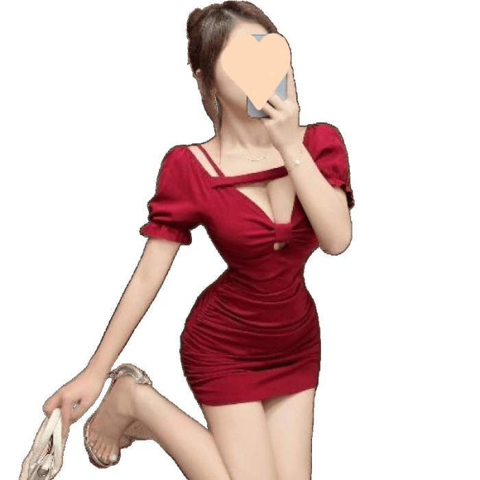胖MM300斤特大碼甜辣妹短袖鏤空綁帶低胸褶皺緊身遮肚包臀連衣裙