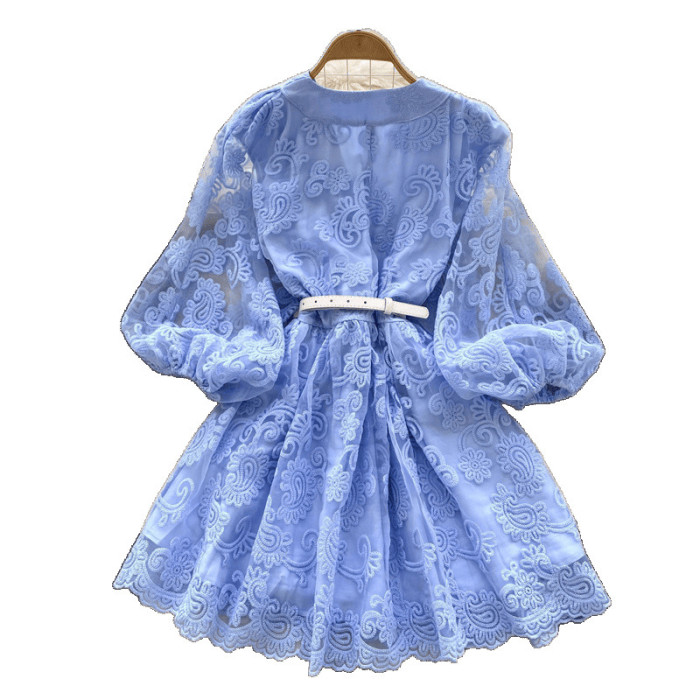法式甜美宮廷風V領燈籠袖重工刺綉收腰顯瘦單排釦A字優雅連衣裙女