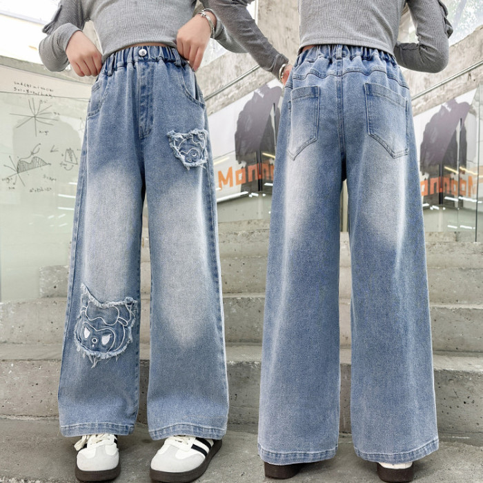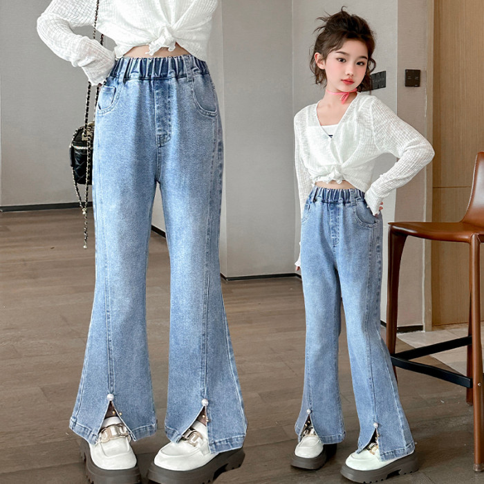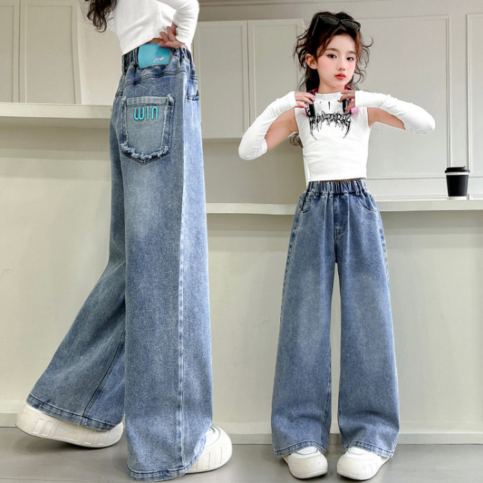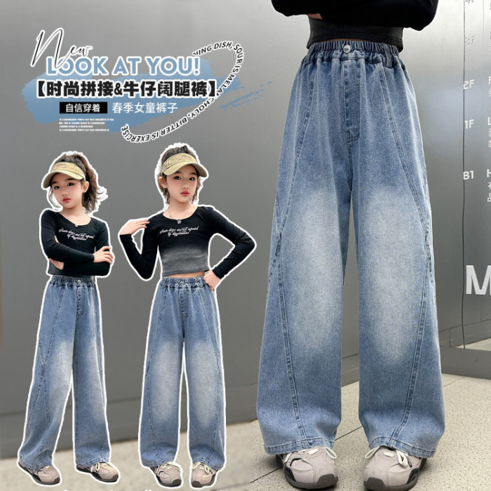 夏款女童牛仔褲春秋款2025新款兒童中大童洋氣時髦直筒褲濶腿褲子