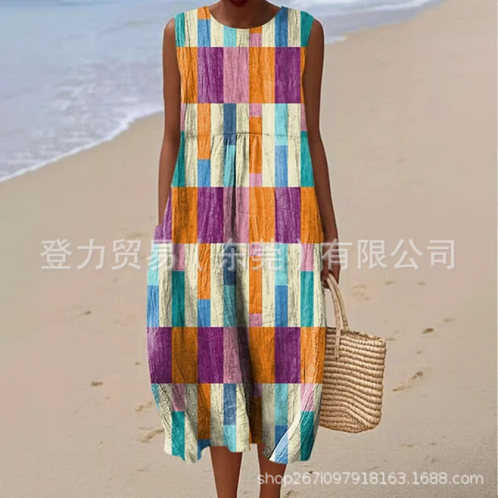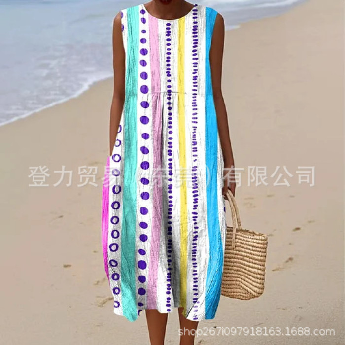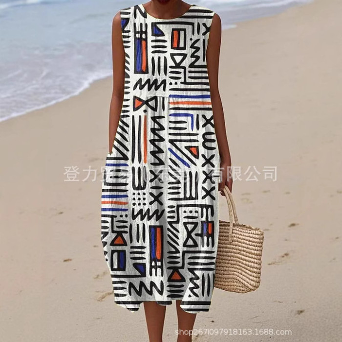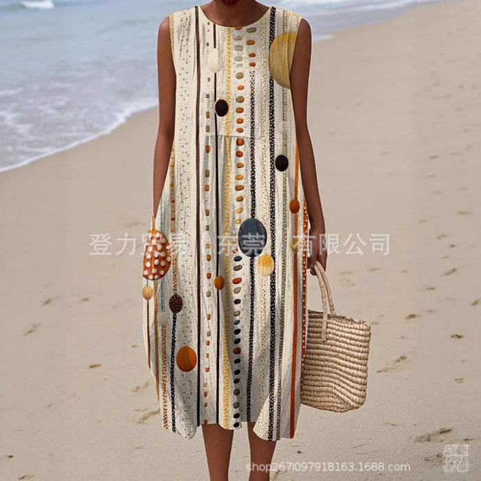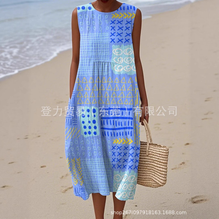 獨立站新款大碼女裝襯衫口袋短袖連衣裙海洋元素魚度假風連衣裙