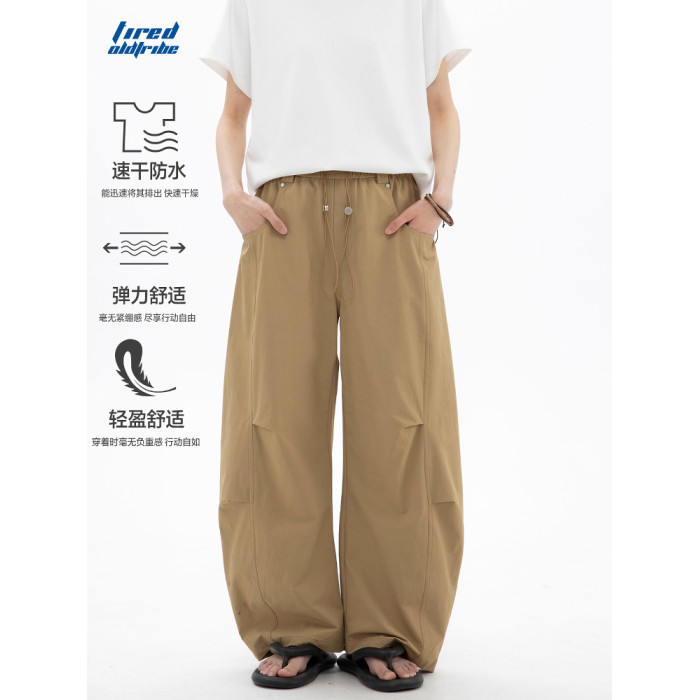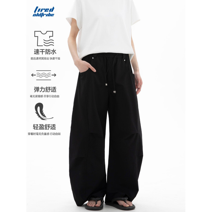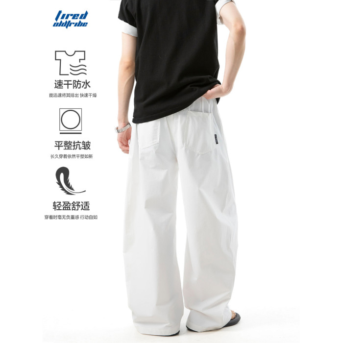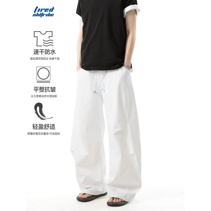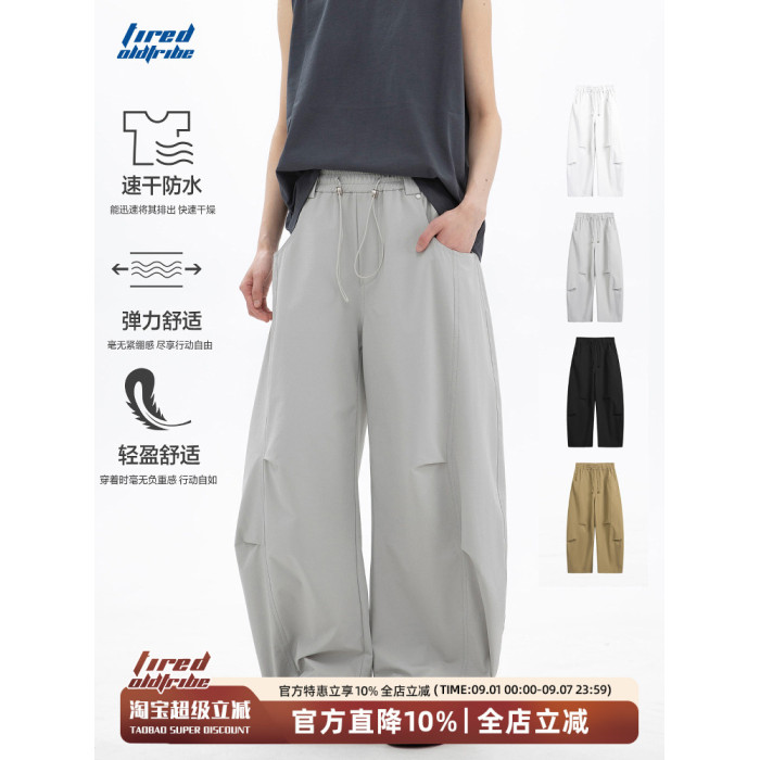 TIRED速乾防水褶皺濶腿褲高級感彎刀褲寬松直筒褲街頭百搭休閒褲