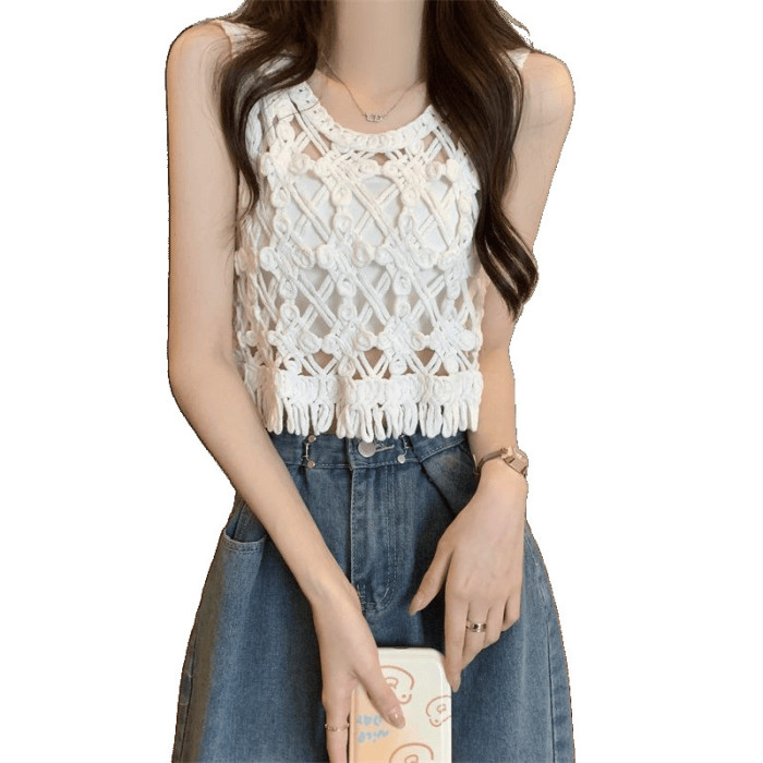 法式鏤空鉤花無袖針織吊帶背心夏季新款辣妹外穿馬甲罩衫短款上衣