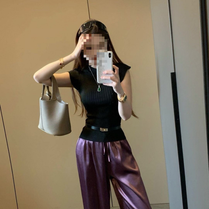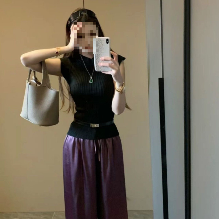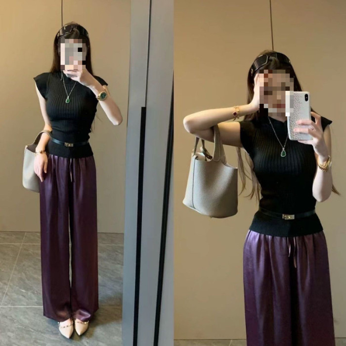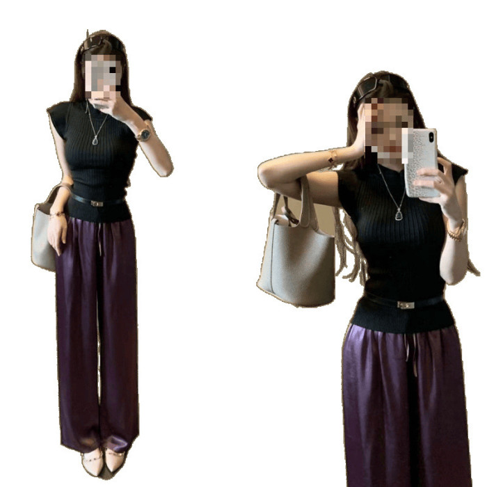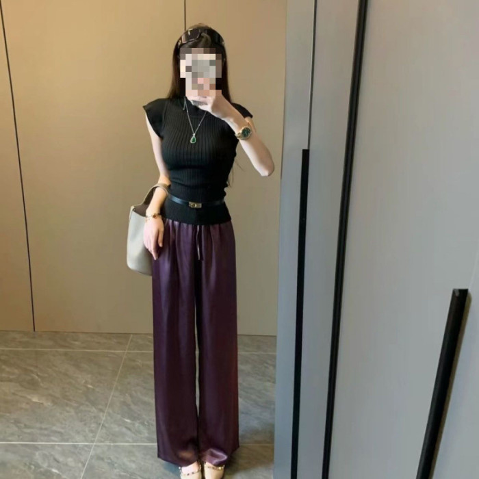 2025夏季新款韓版顯瘦飛飛袖針織衫上衣+高腰韻味緞面濶腿褲套裝