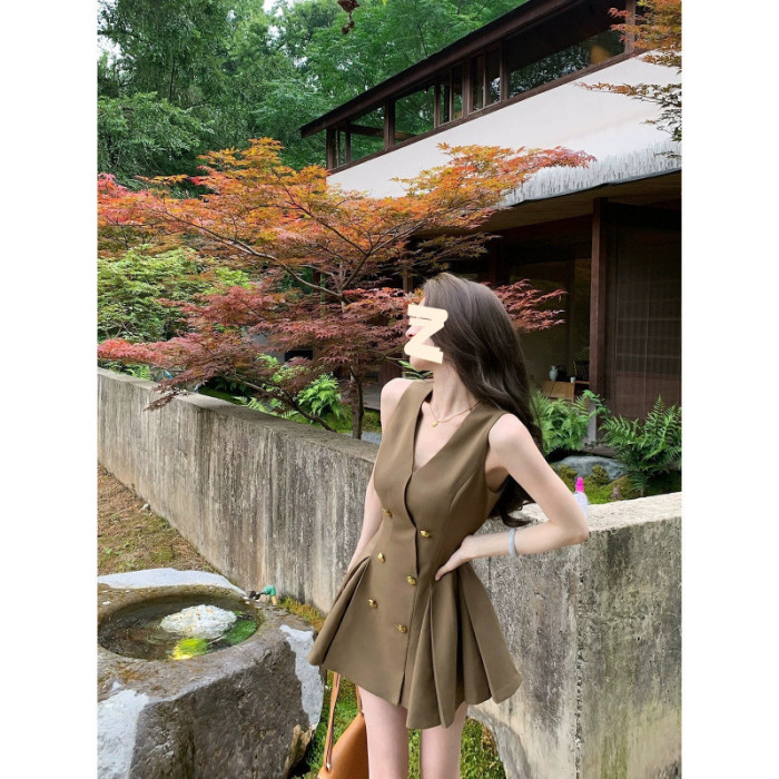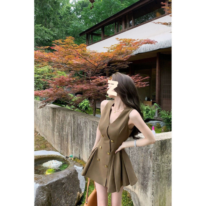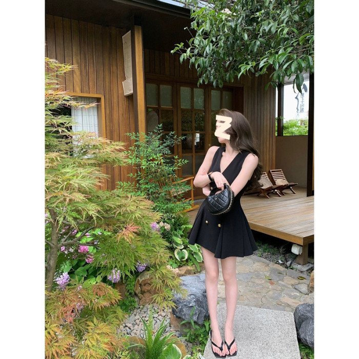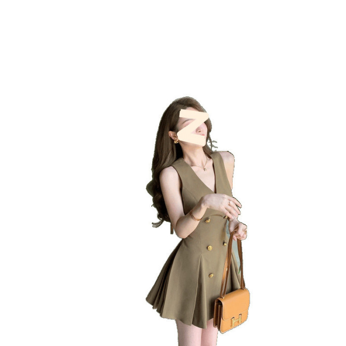 法式輕奢千金感v領重工金釦收腰連衣裙女夏季無袖高級感顯瘦短裙