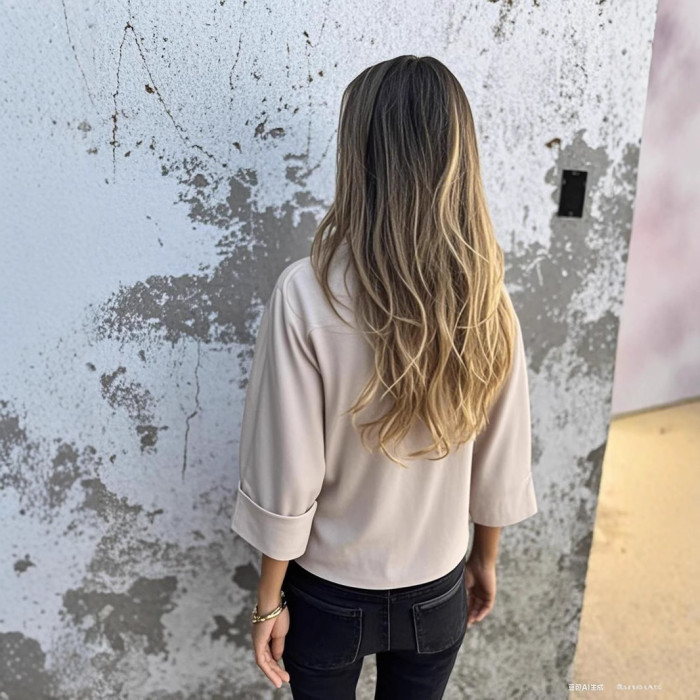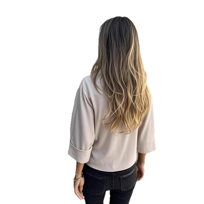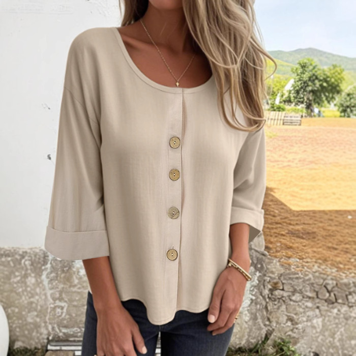 2025歐美新款寬松T恤衫女士圓領棉麻紐釦 上衣開衫襯衫