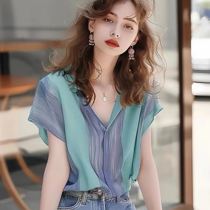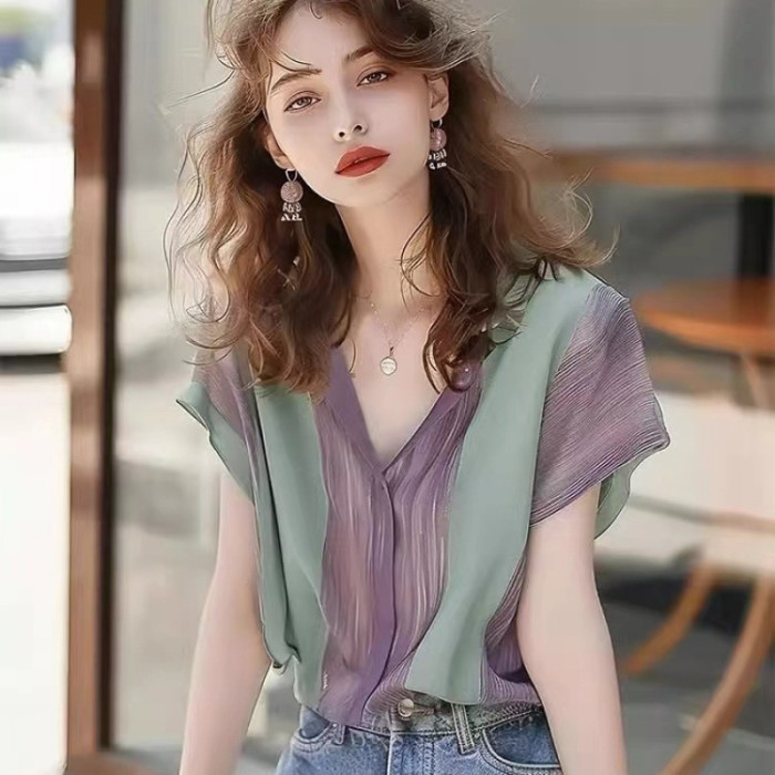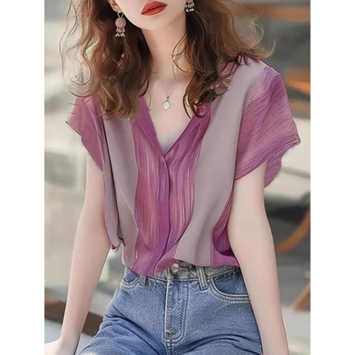 法式超仙紫色條紋拼接清新輕奢短袖襯衫2024新款高級上衣女夏外穿