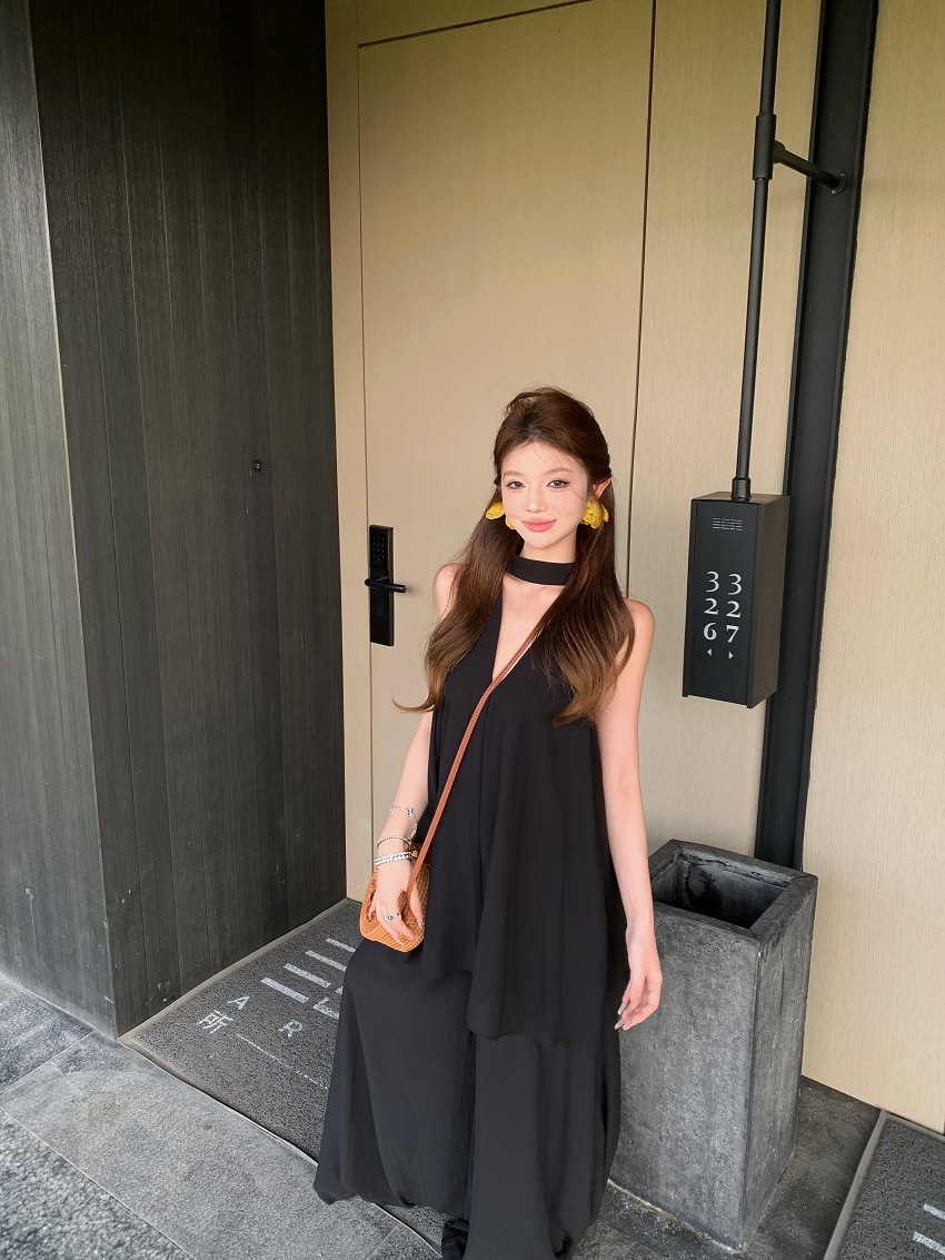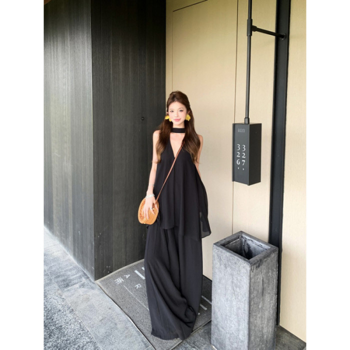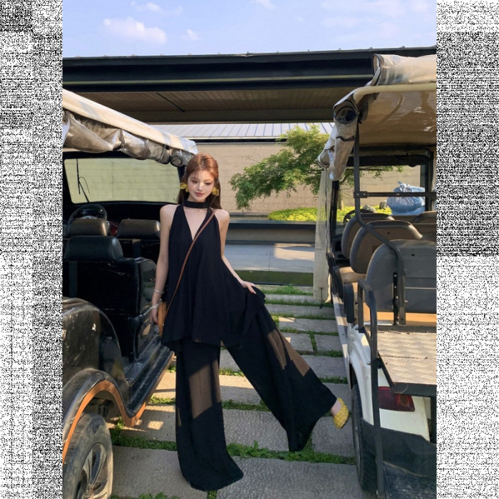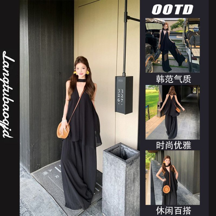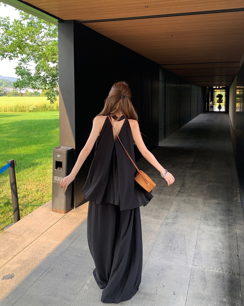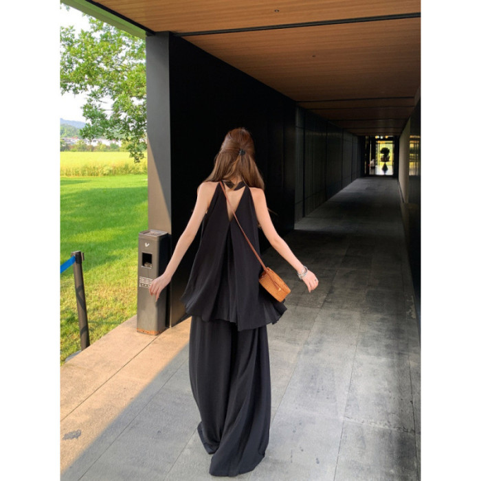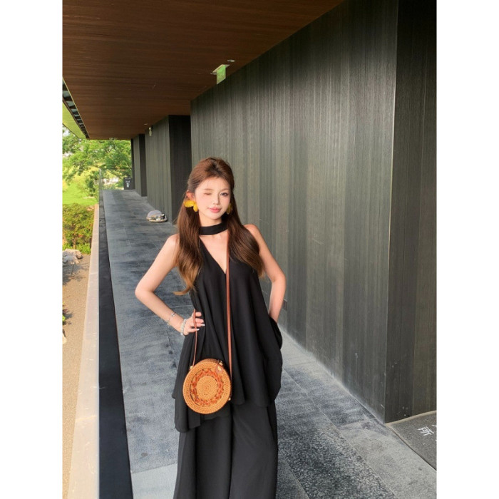氣質名媛套裝黑色掛脖無袖背心女裝夏季新款寬松濶腿休閒褲兩件套