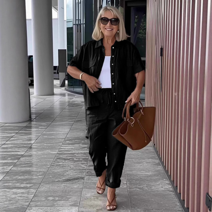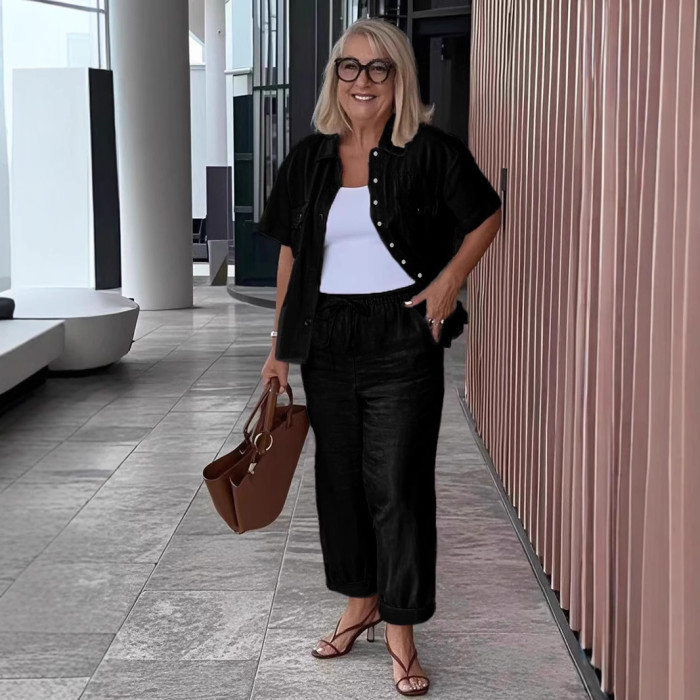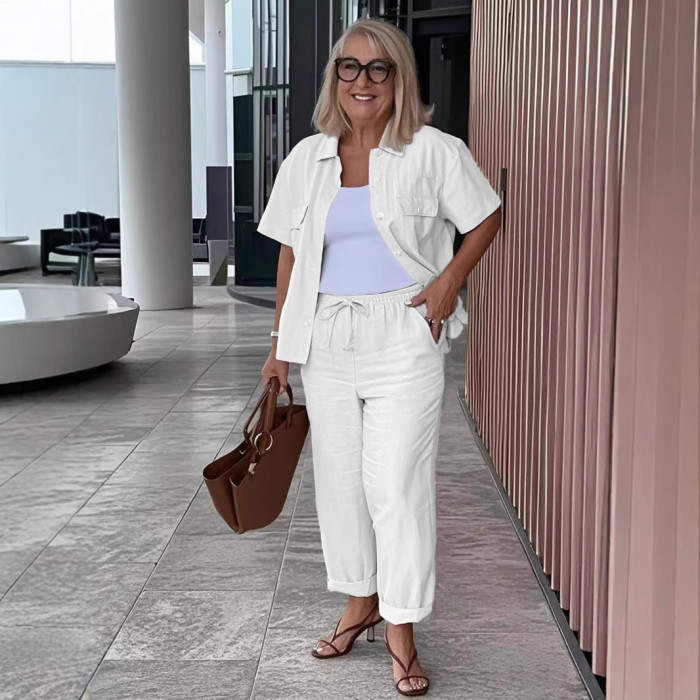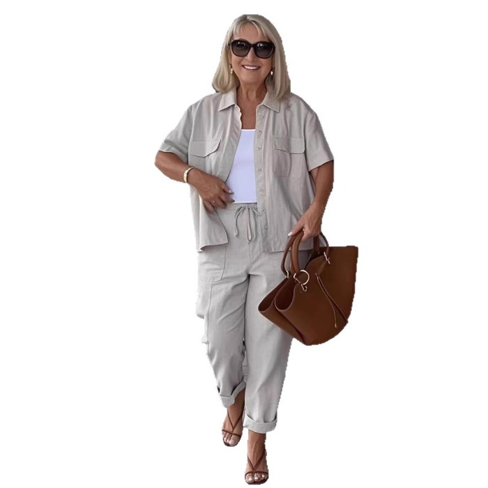 2025歐美春夏獨立站休閒套裝棉麻-翻領西裝外套寬松長褲套裝