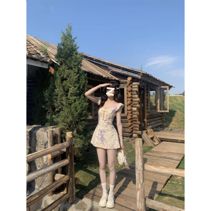 法式復古小飛袖連衣裙氣質收腰顯瘦A字短裙女