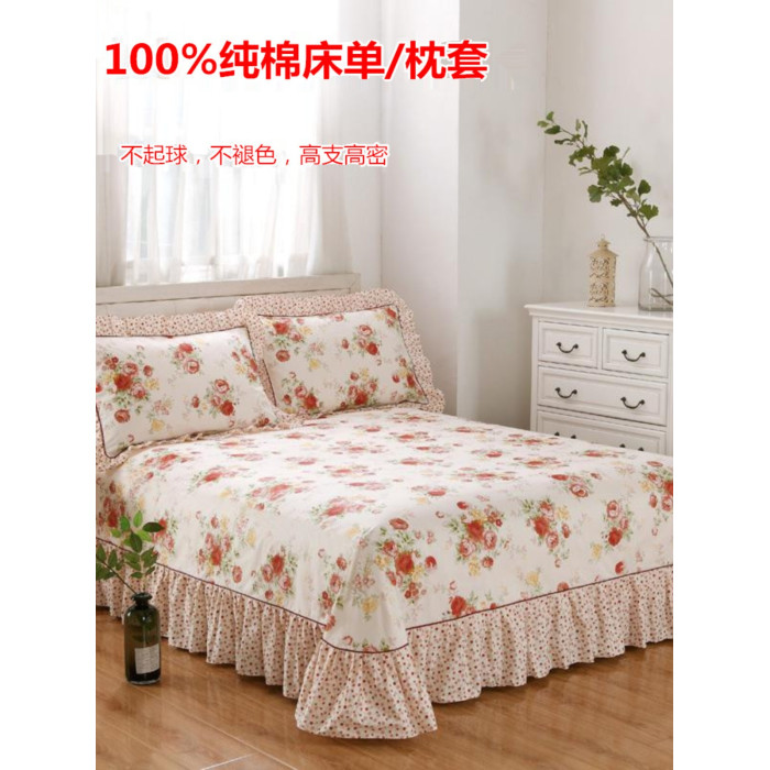 夏季全棉床單單件100%純棉三件套單雙人粉色花邊柔軟被單加大2.2m
