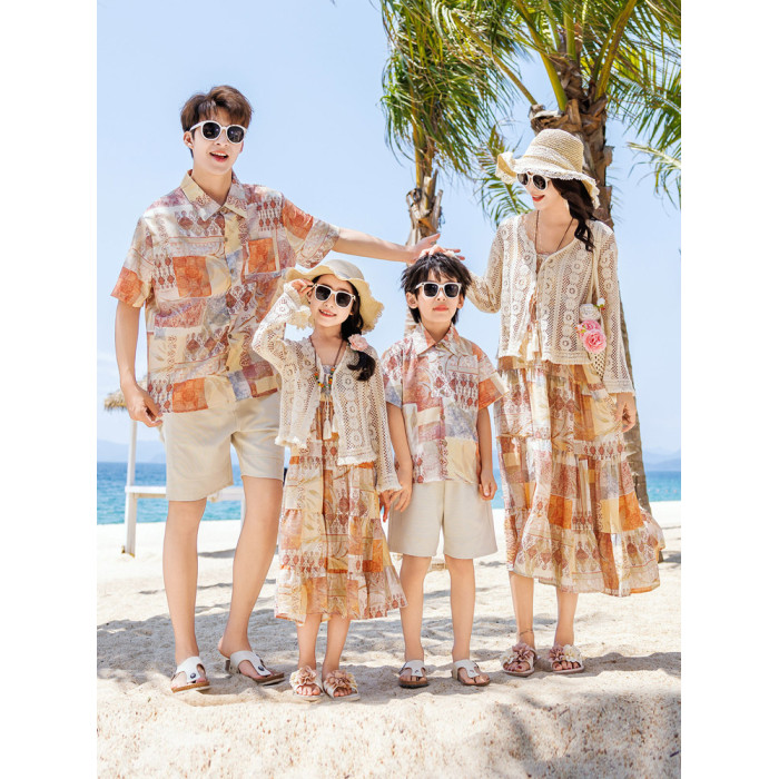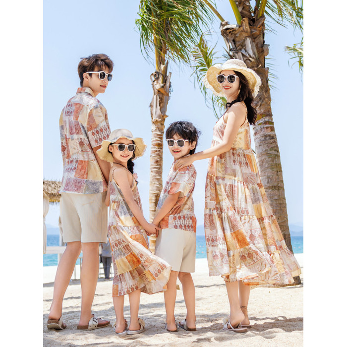 親子裝夏季一家三四口夏威夷襯衫母女海邊度假波西米亞吊帶連衣裙