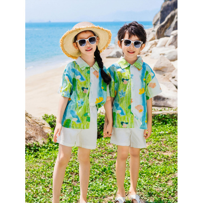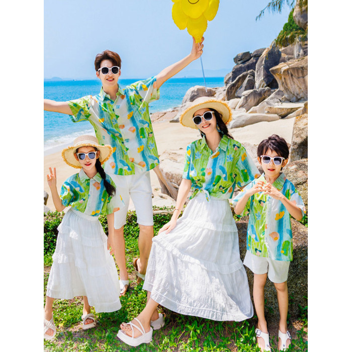高級海邊度假親子裝短袖襯衫母女裝連衣裙一家三口夏季新款沙灘裙