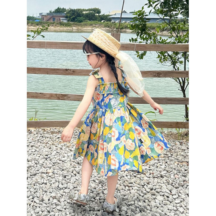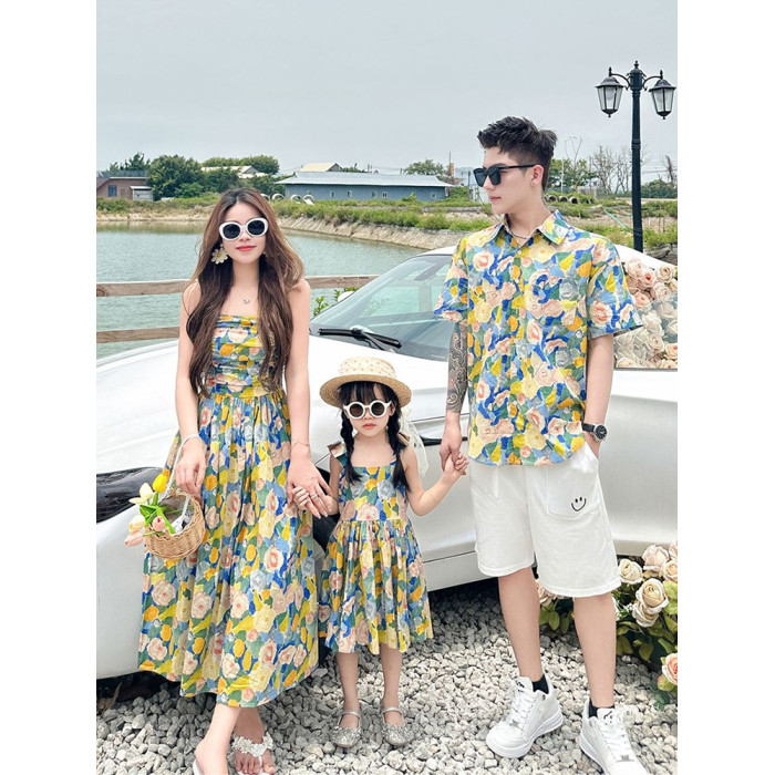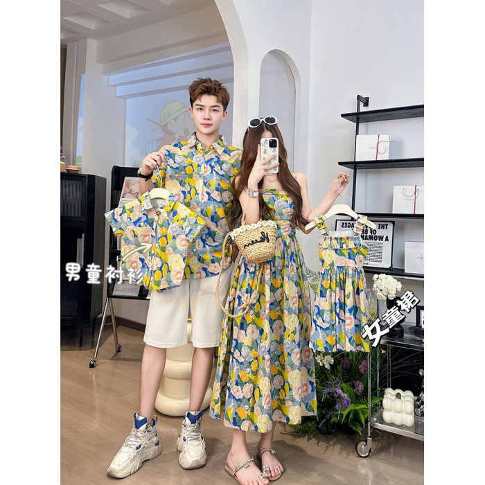 海邊度假親子裝母女裝一家三口四口出遊花色碎花襯衫衣沙灘連衣裙