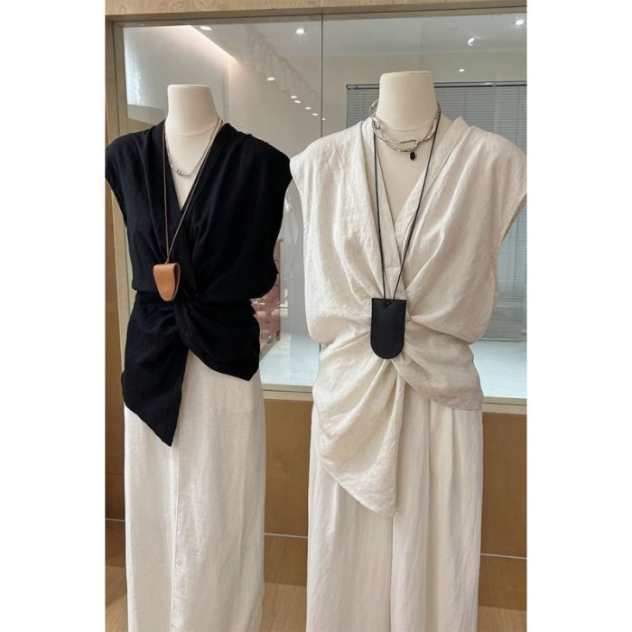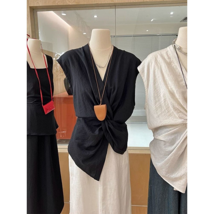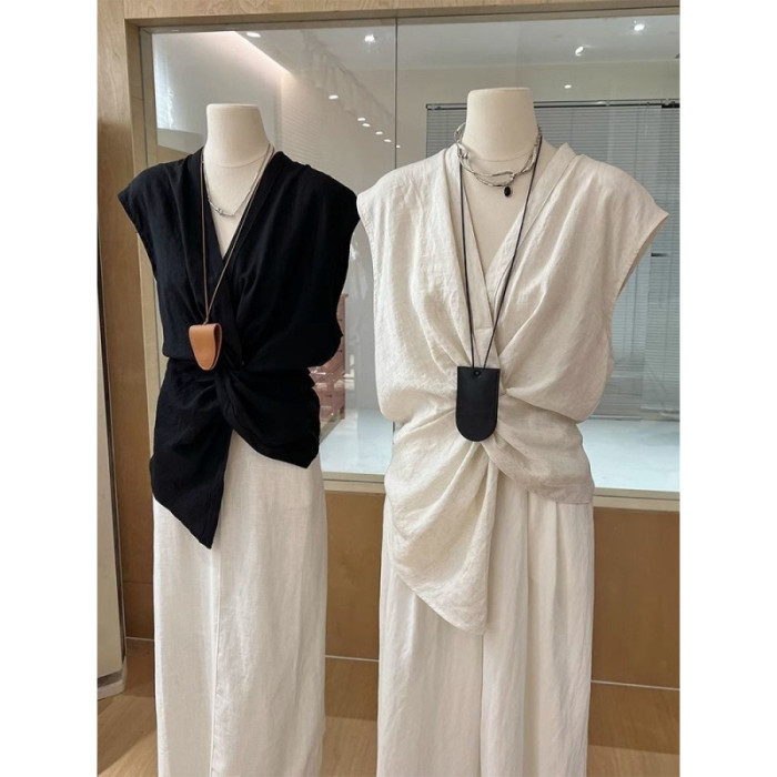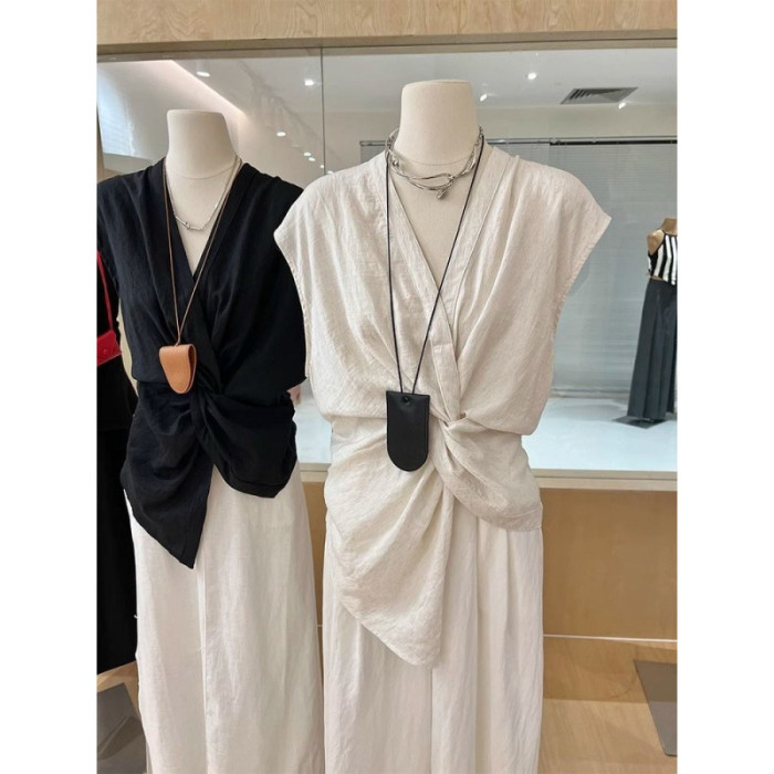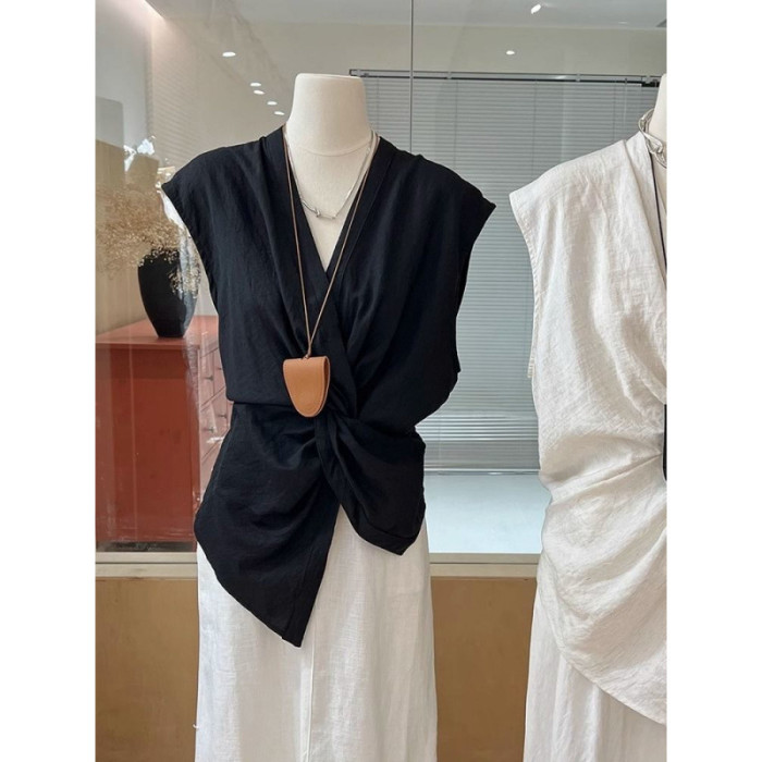 法式輕熟風V領扭結襯衫夏季氣質設計感寬松收腰顯瘦無袖亞麻上衣