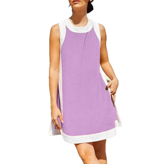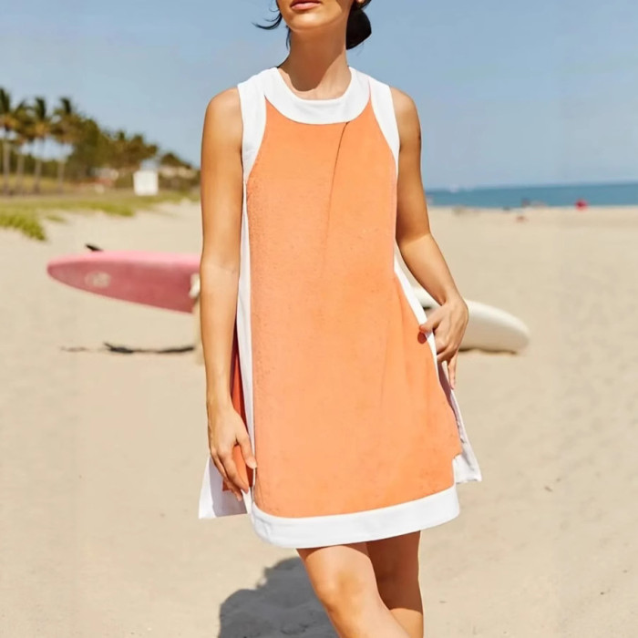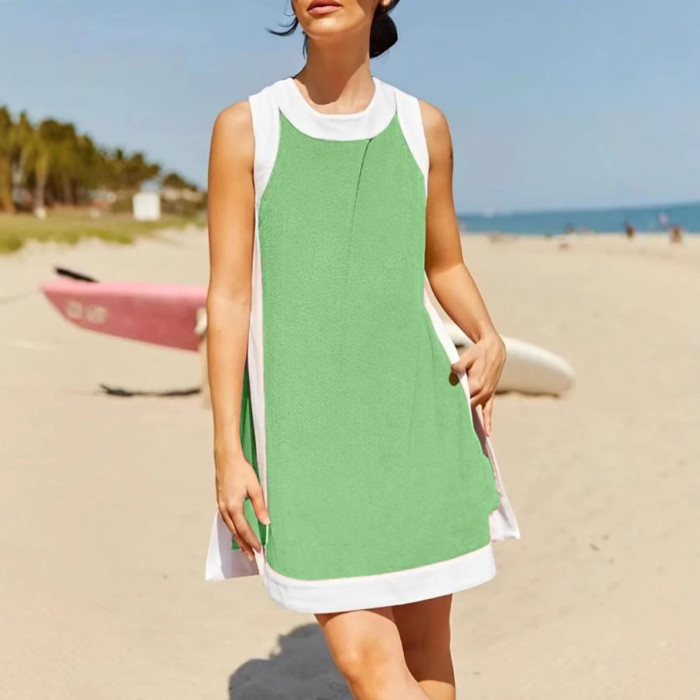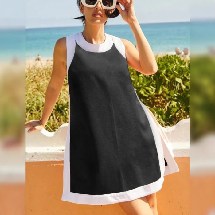 獨立站夏季新款女士休閒拼色圓領無袖上衣搭配短褲套裝