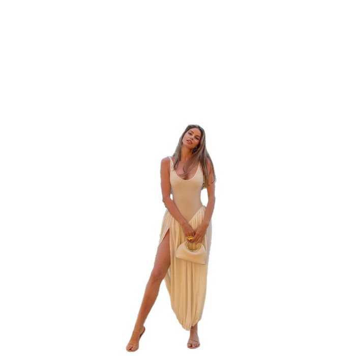 2025夏新款純色氣質U型領高開叉壓褶露背長裙修身背心裙