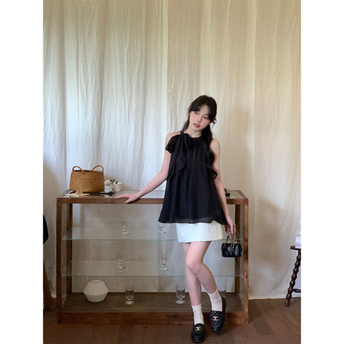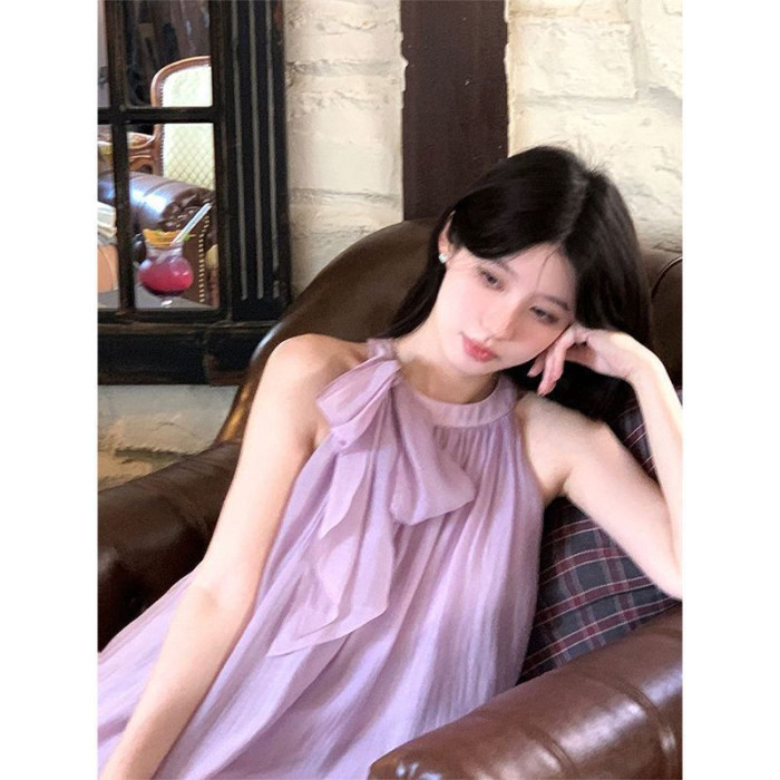 法式溫柔風紫色蝴蝶結無袖上衣女夏季高級感氣質顯瘦露肩掛脖小衫