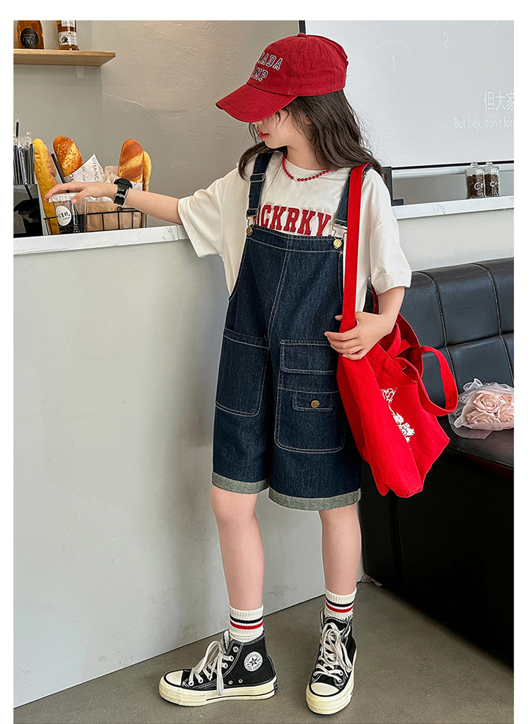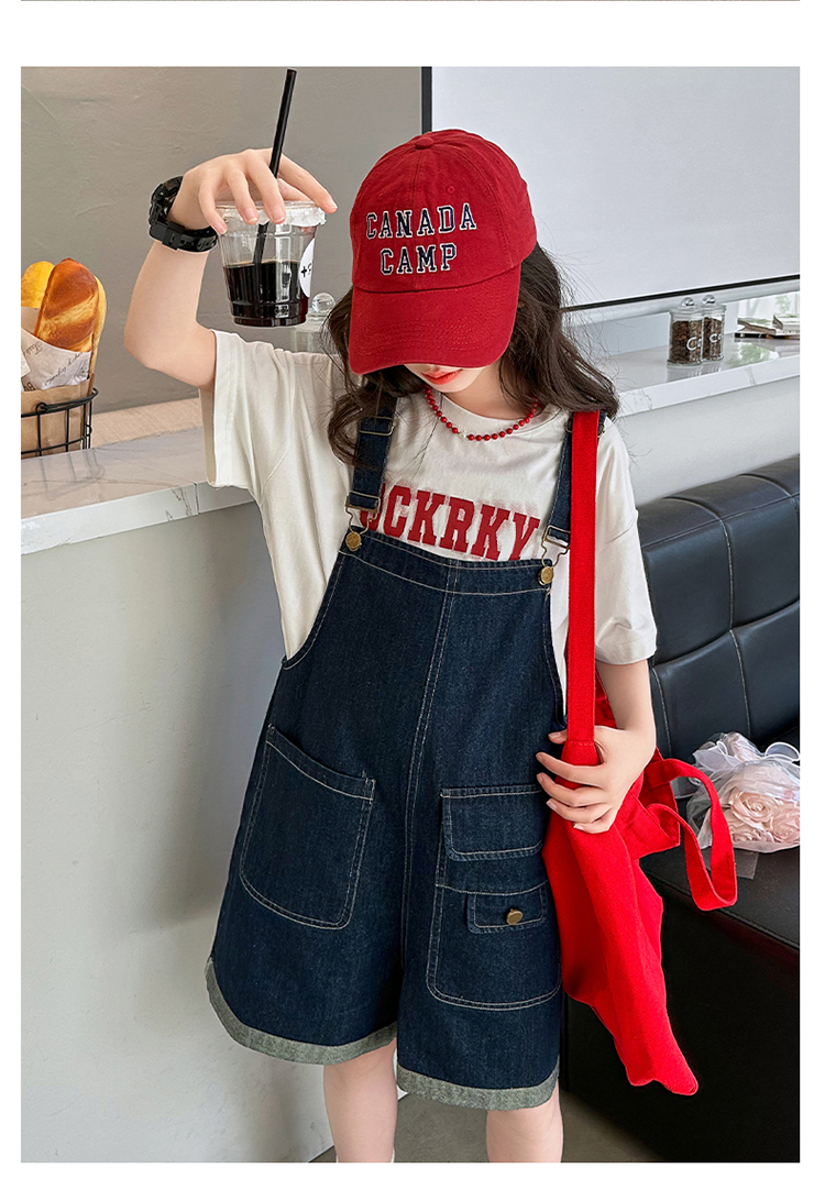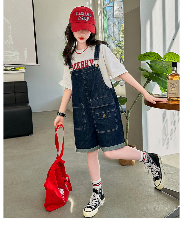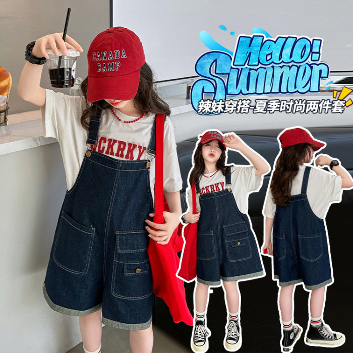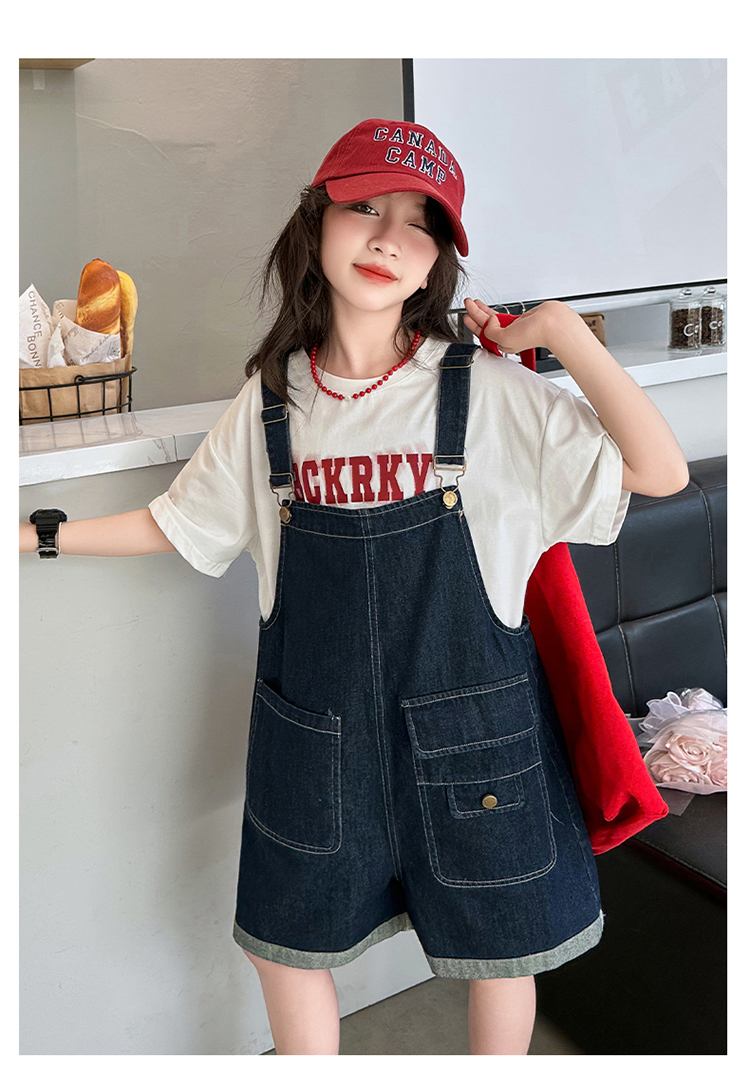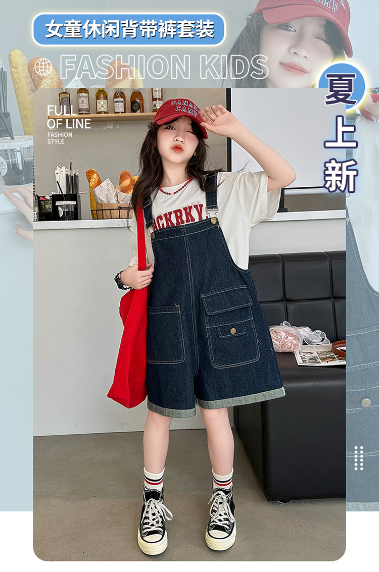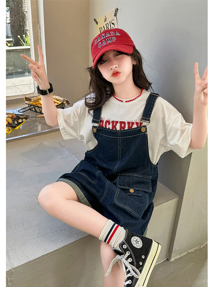 女童背帶褲套裝夏季中大童寬松休閒直筒洋氣短袖T恤牛仔吊帶短褲9