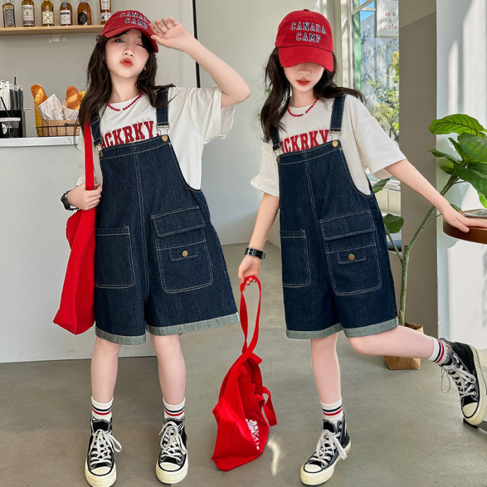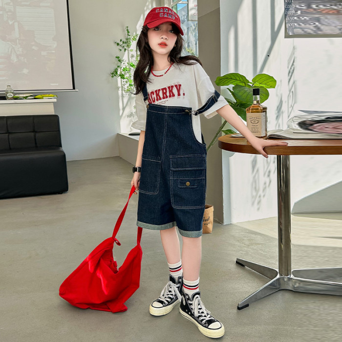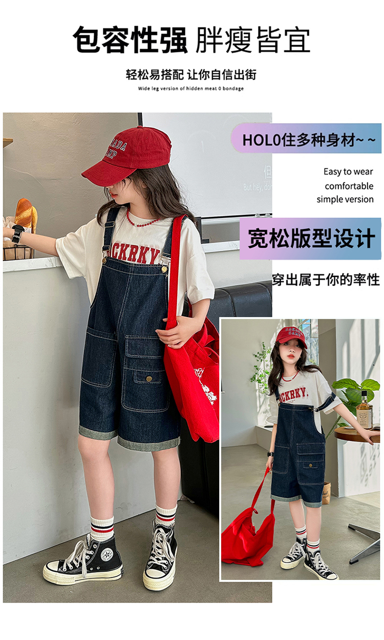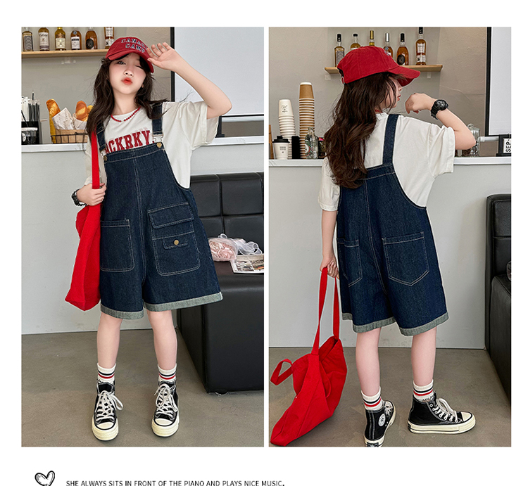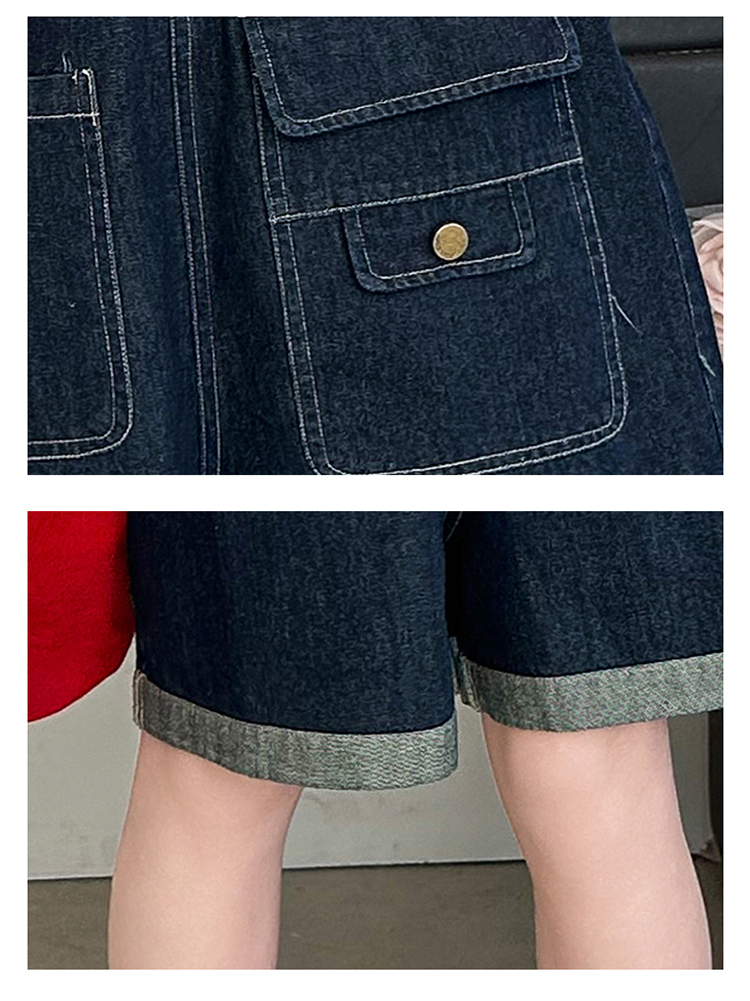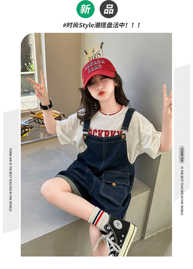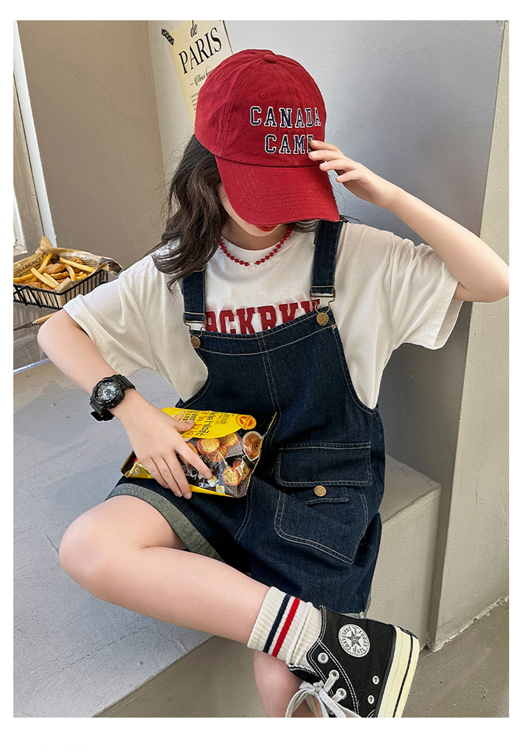 女童背帶褲套裝夏季中大童寬松休閒直筒洋氣短袖T恤牛仔吊帶短褲9