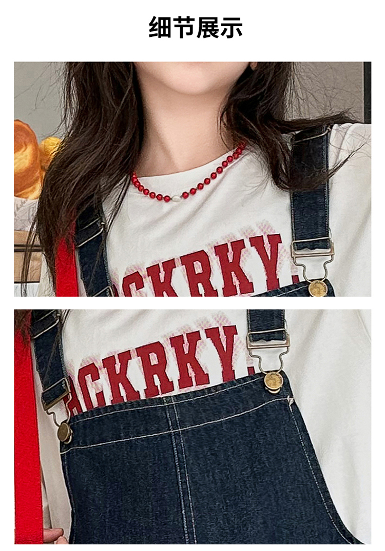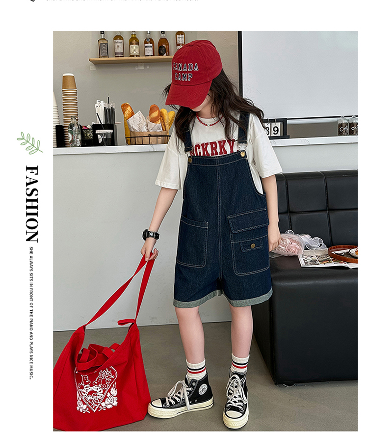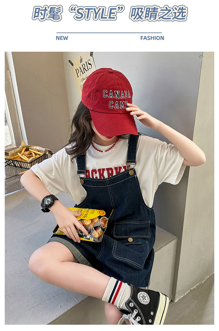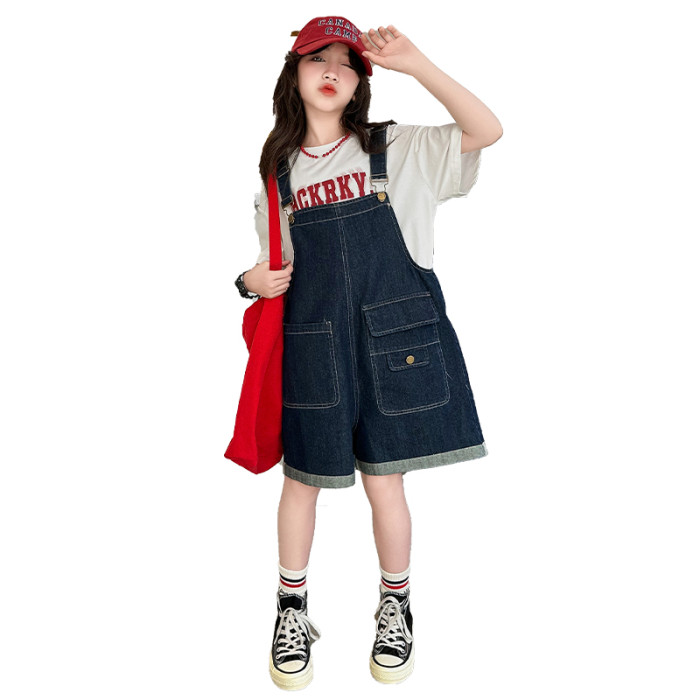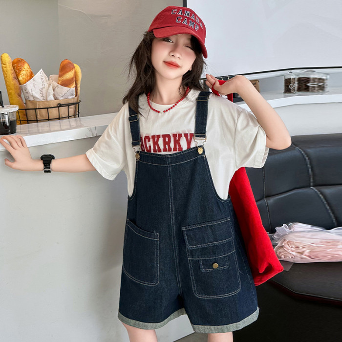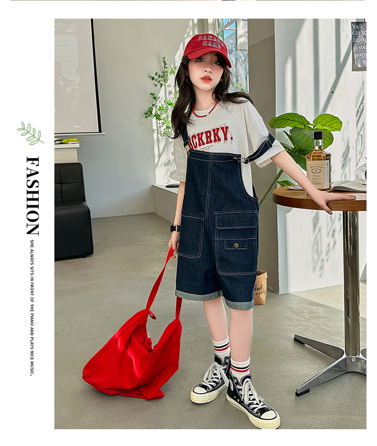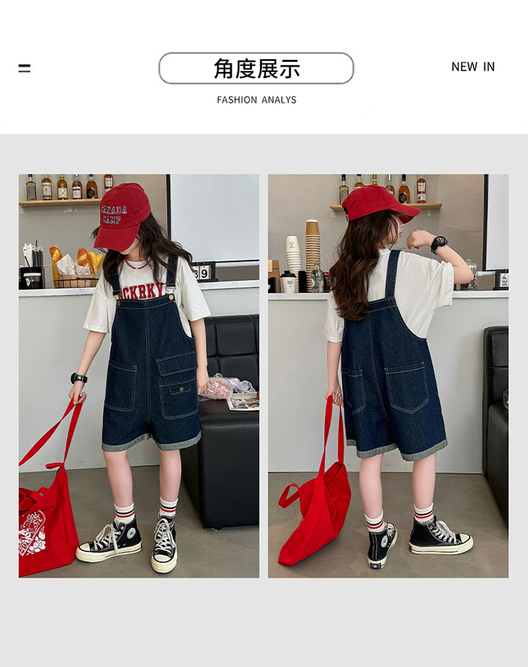 女童背帶褲套裝夏季中大童寬松休閒直筒洋氣短袖T恤牛仔吊帶短褲9