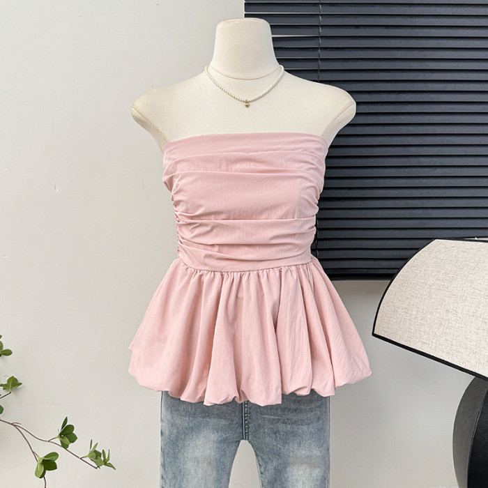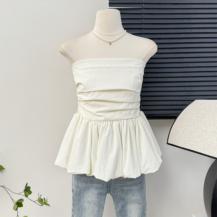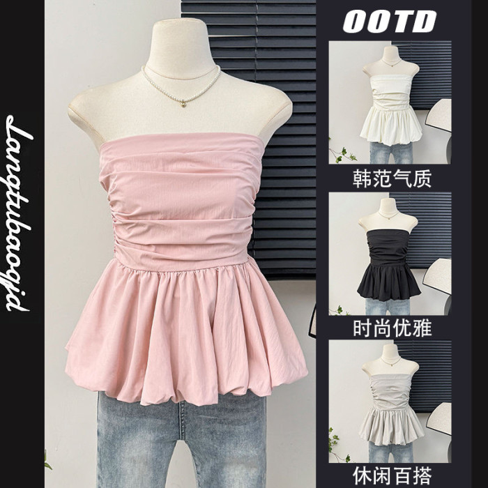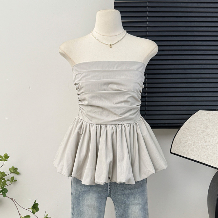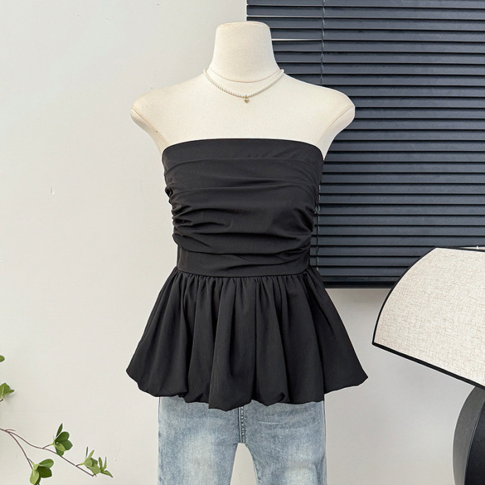 法式一字肩褶皺修身顯瘦性感抹胸背心女夏季純欲風荷葉邊裙擺上衣