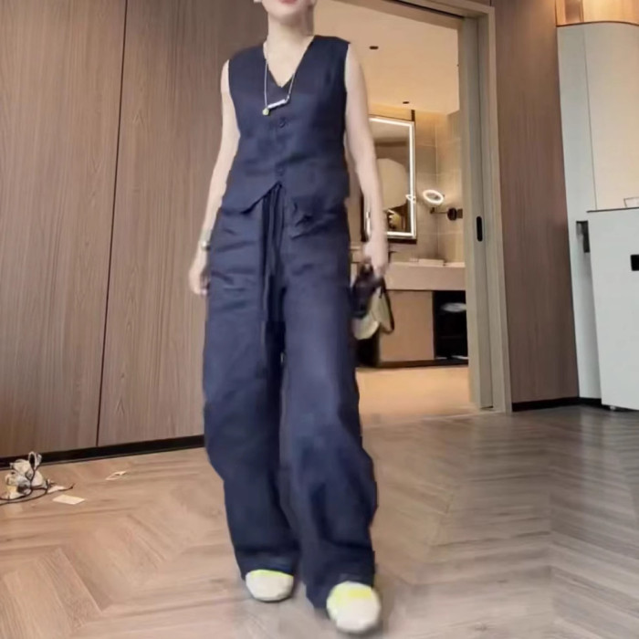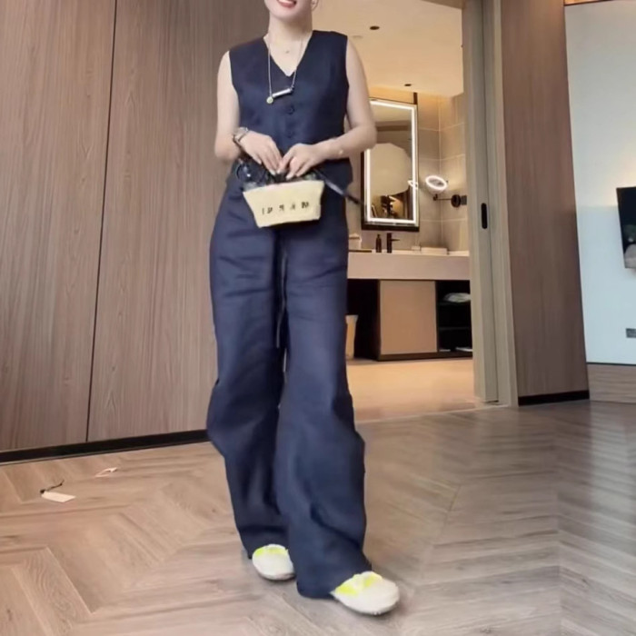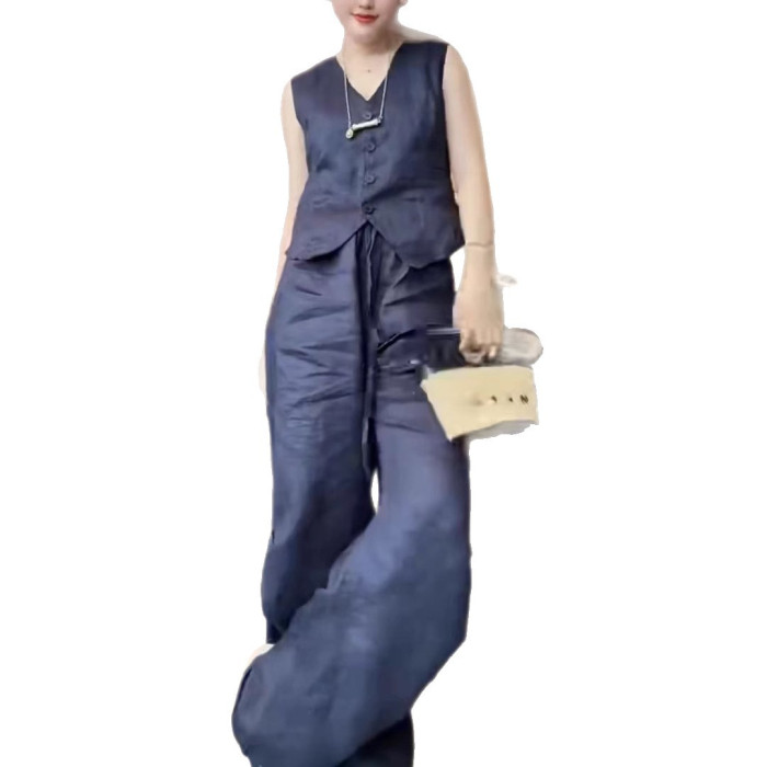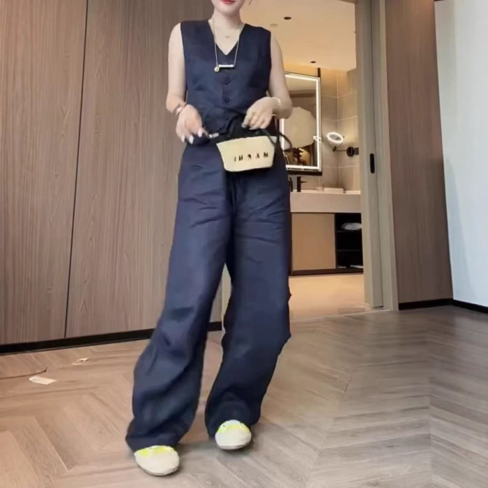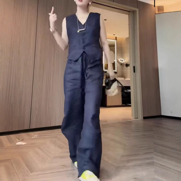 25705新大愛美依緣2025夏季新簡約高級感v領馬甲上衣+濶腿褲套裝